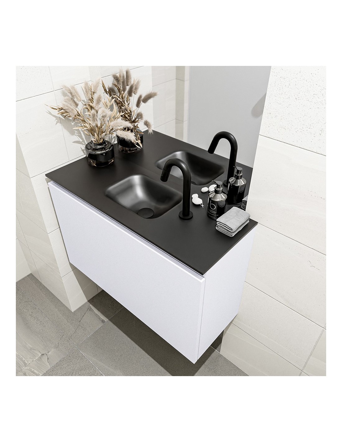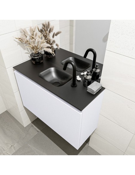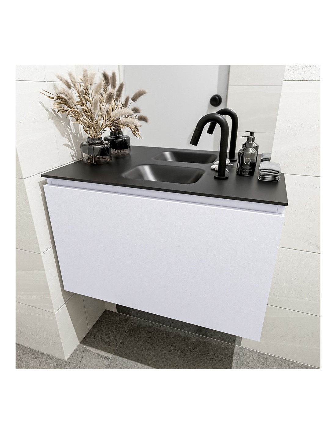 OLAN Komplet badmiljø med midt centreret håndvask til bordmonteret armatur. Badmiljøet kommer med 1 skuffe med fuldt udtræk, og er fremstillet i MDF. Håndvasken er fremstillet i sort solid surface. Badmiljøet måler 80 cm i bredden. Det viste armatur medfølger ikke i sættet.