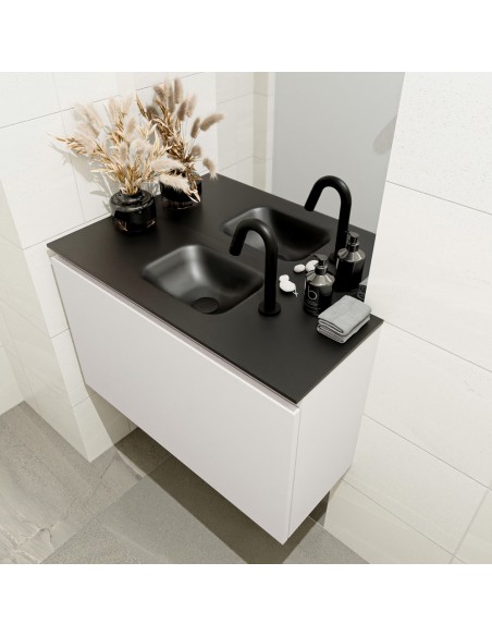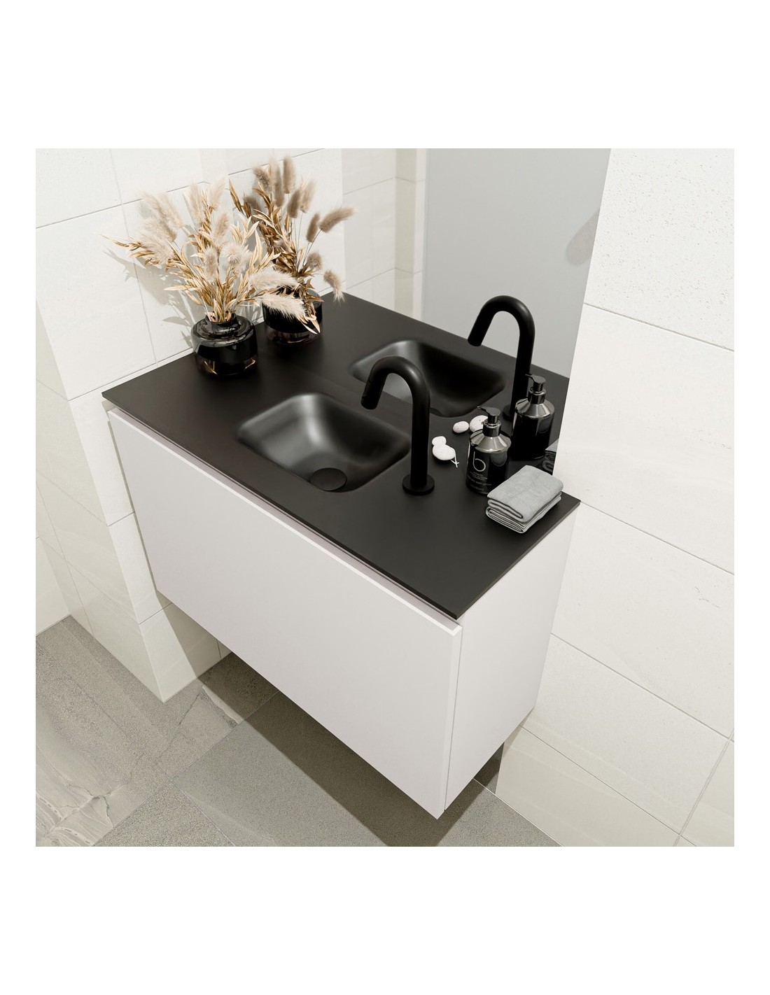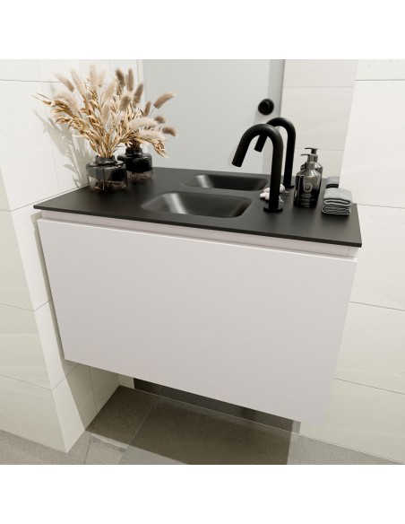 OLAN Komplet badmiljø med midt centreret håndvask til bordmonteret armatur. Badmiljøet kommer med 1 skuffe med fuldt udtræk, og er fremstillet i MDF. Håndvasken er fremstillet i sort solid surface. Badmiljøet måler 80 cm i bredden. Det viste armatur medfølger ikke i sættet.
