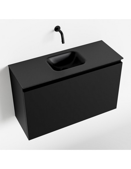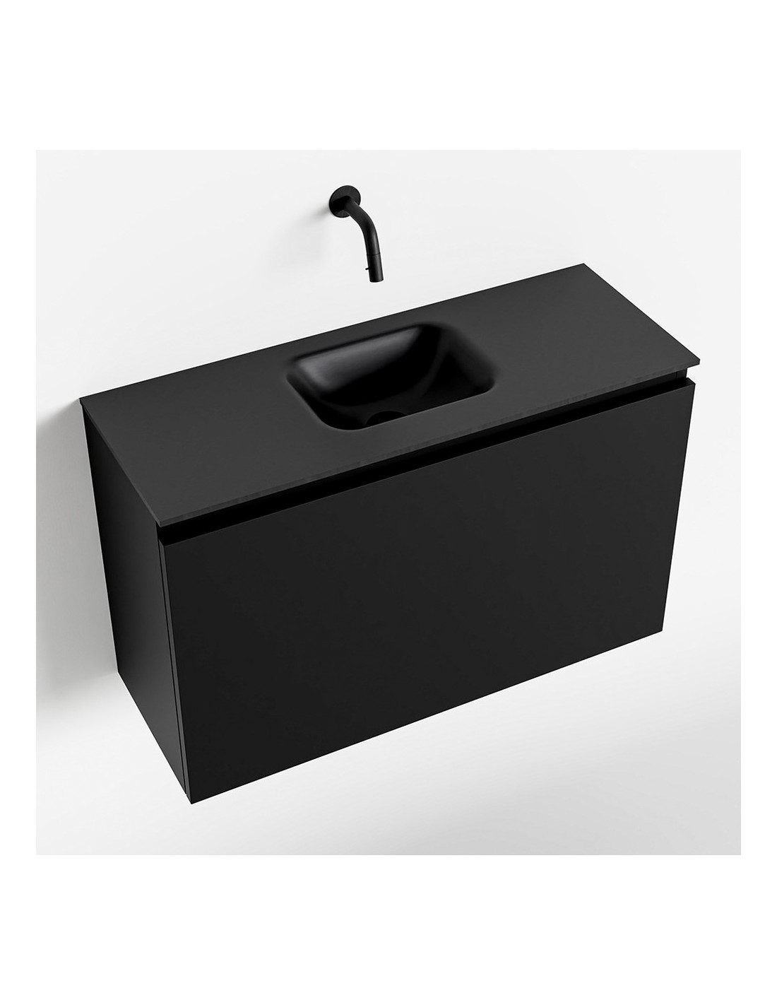 OLAN Komplet badmiljø med midt centreret håndvask til vægmonteret armatur. Badmiljøet kommer med 1 skuffe med fuldt udtræk, og er fremstillet i MDF. Håndvasken er fremstillet i sort solid surface. Badmiljøet måler 80 cm i bredden. Det viste armatur medfølger ikke i sættet.