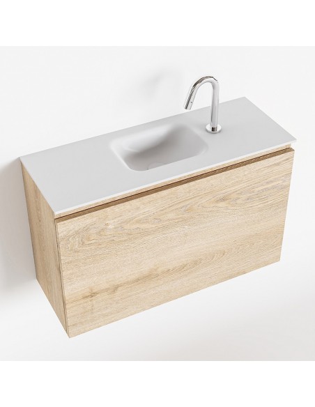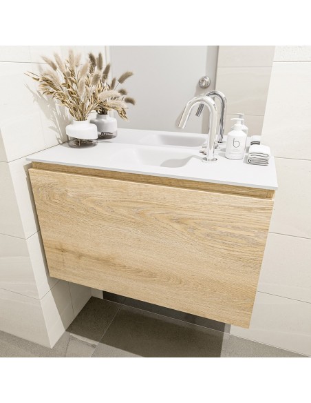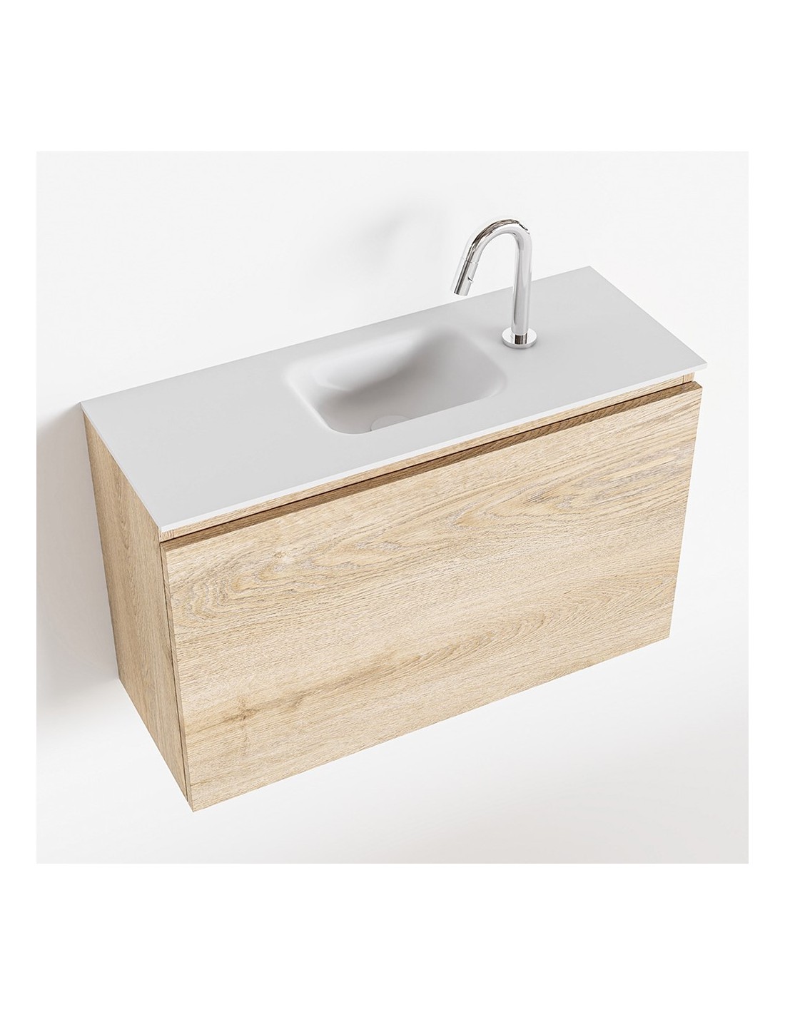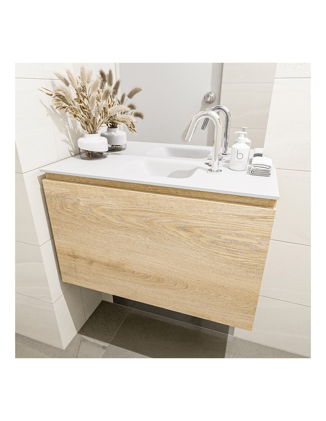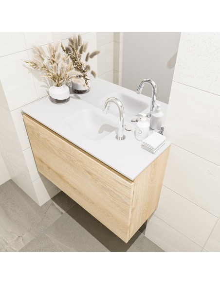 OLAN Komplet badmiljø med midt centreret håndvask til bordmonteret armatur. Badmiljøet kommer med 1 skuffe med fuldt udtræk, og er fremstillet i MDF med design af vasket eg. Håndvasken er fremstillet i talkumsfarvet (mat hvid) solid surface. Badmiljøet måler 80 cm i bredden. Det viste armatur medfølger ikke i sættet.