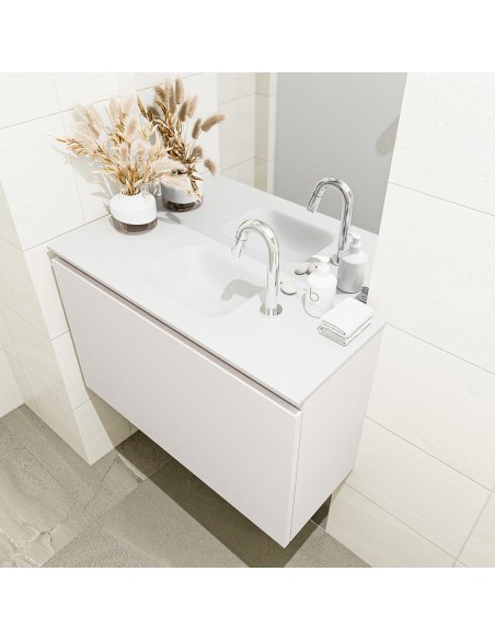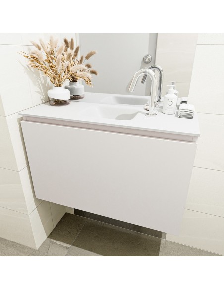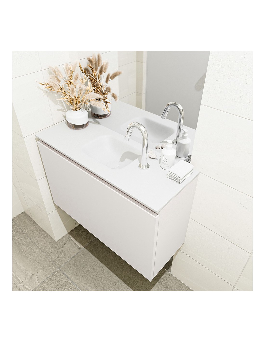 OLAN Komplet badmiljø med midt centreret håndvask til bordmonteret armatur. Badmiljøet kommer med 1 skuffe med fuldt udtræk, og er fremstillet i MDF. Håndvasken er fremstillet i talkumsfarvet (mat hvid) solid surface. Badmiljøet måler 80 cm i bredden. Det viste armatur medfølger ikke i sættet.