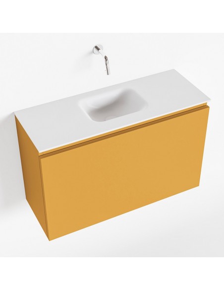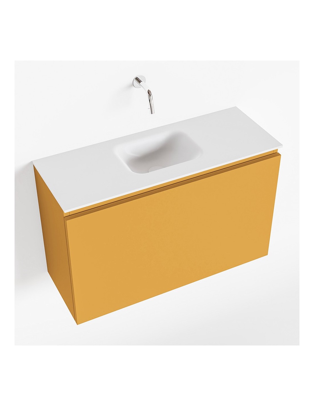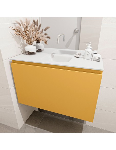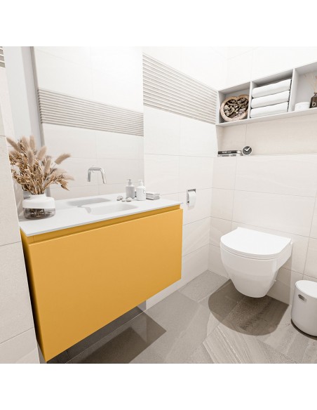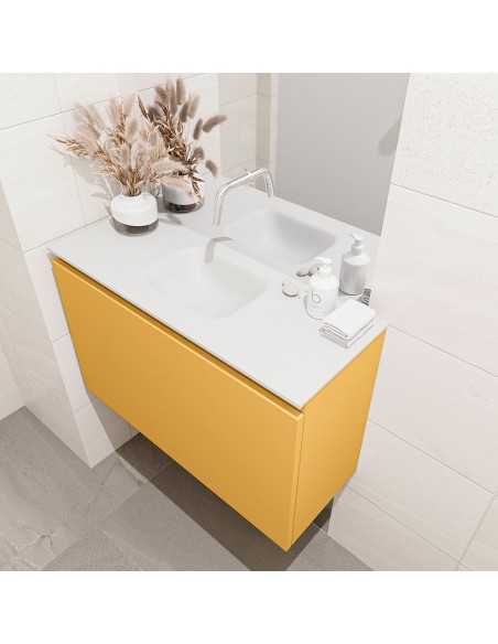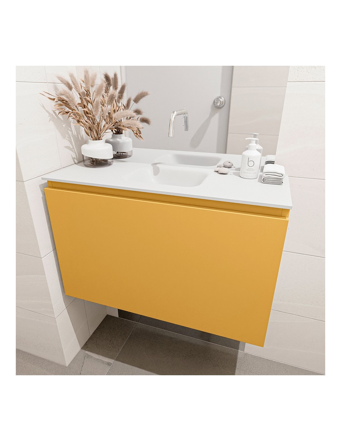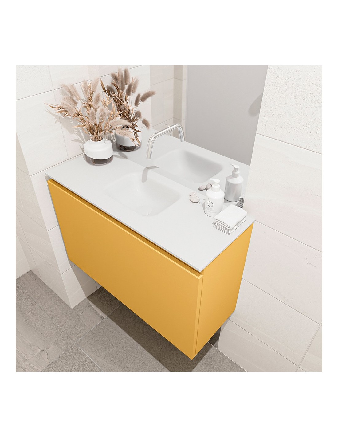 OLAN Komplet badmiljø med midt centreret håndvask til vægmonteret armatur. Badmiljøet kommer med 1 skuffe med fuldt udtræk, og er fremstillet i MDF. Håndvasken er fremstillet i talkumsfarvet (mat hvid) solid surface. Badmiljøet måler 80 cm i bredden. Det viste armatur medfølger ikke i sættet.