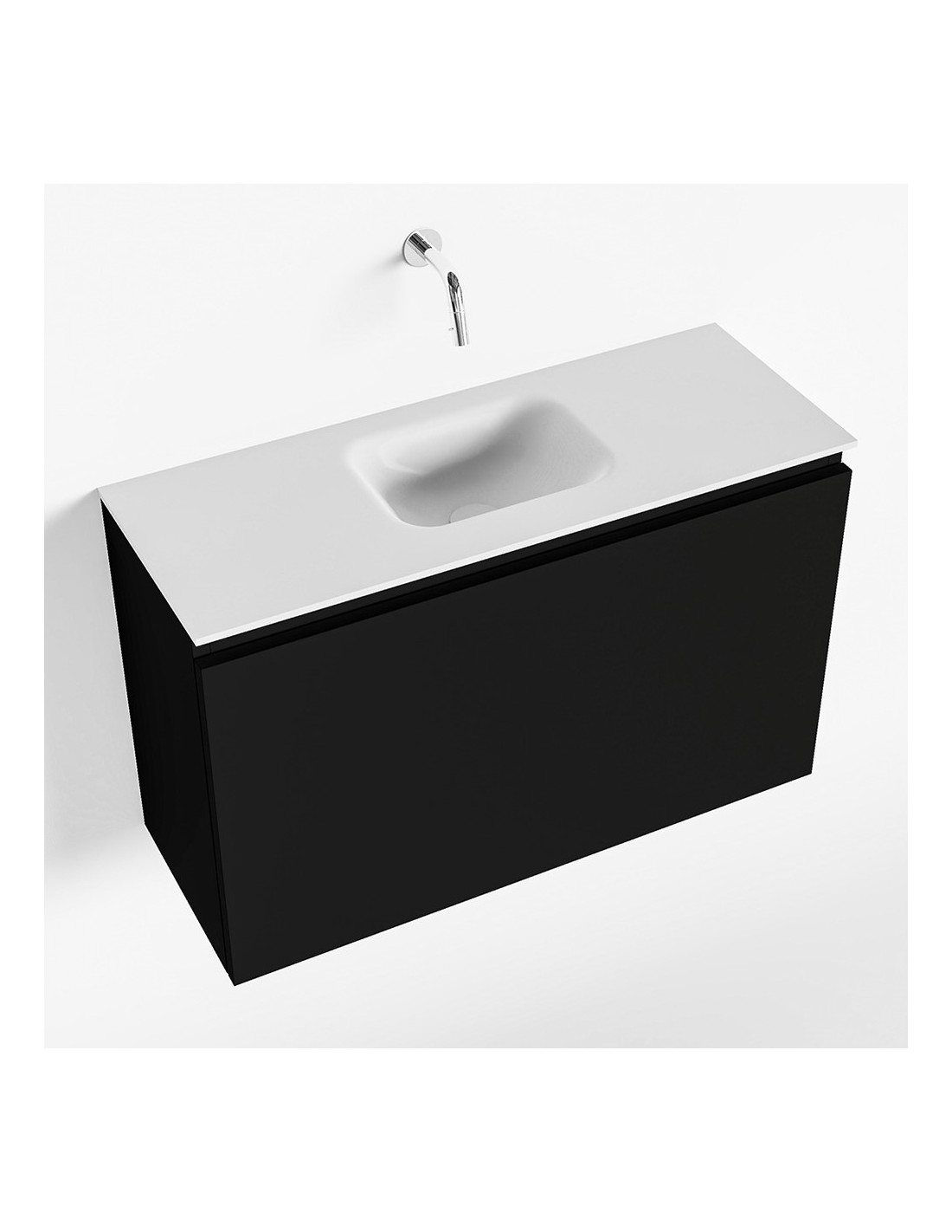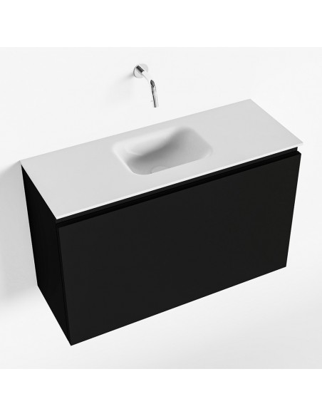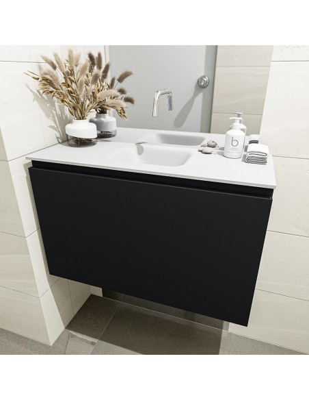 OLAN Komplet badmiljø med midt centreret håndvask til vægmonteret armatur. Badmiljøet kommer med 1 skuffe med fuldt udtræk, og er fremstillet i MDF. Håndvasken er fremstillet i talkumsfarvet (mat hvid) solid surface. Badmiljøet måler 80 cm i bredden. Det viste armatur medfølger ikke i sættet.