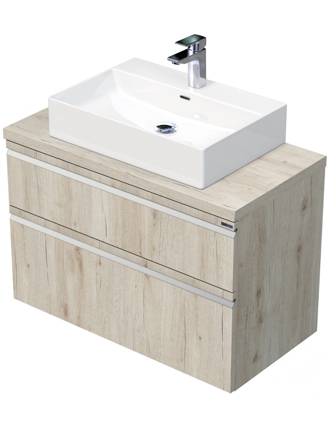 BRAVE Komplet badmiljø med håndvask til bordmonteret armatur. Badmiljøet kommer med 2 skuffer med softclose og er fremstillet i MDF. Håndvasken er fremstillet i hvid keramik. Badmiljøet måler 90 cm i bredden. Det viste armatur medfølger ikke i sættet.