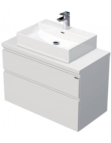 LETTY Komplet badmiljø med håndvask til bordmonteret armatur. Badmiljøet kommer med 2 skuffer med softclose og er fremstillet i MDF. Håndvasken er fremstillet i hvid keramik. Badmiljøet måler 90 cm i bredden. Det viste armatur medfølger ikke i sættet.