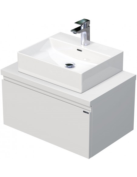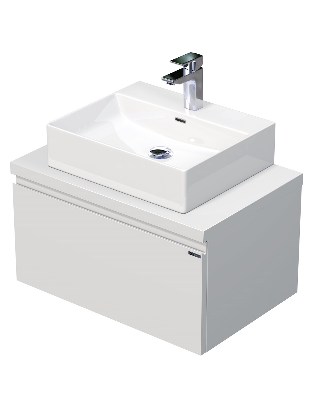 LETTY Komplet badmiljø med håndvask til bordmonteret armatur. Badmiljøet kommer med 1 skuffe med softclose og er fremstillet i MDF. Håndvasken er fremstillet i hvid keramik. Badmiljøet måler 70 cm i bredden. Det viste armatur medfølger ikke i sættet.