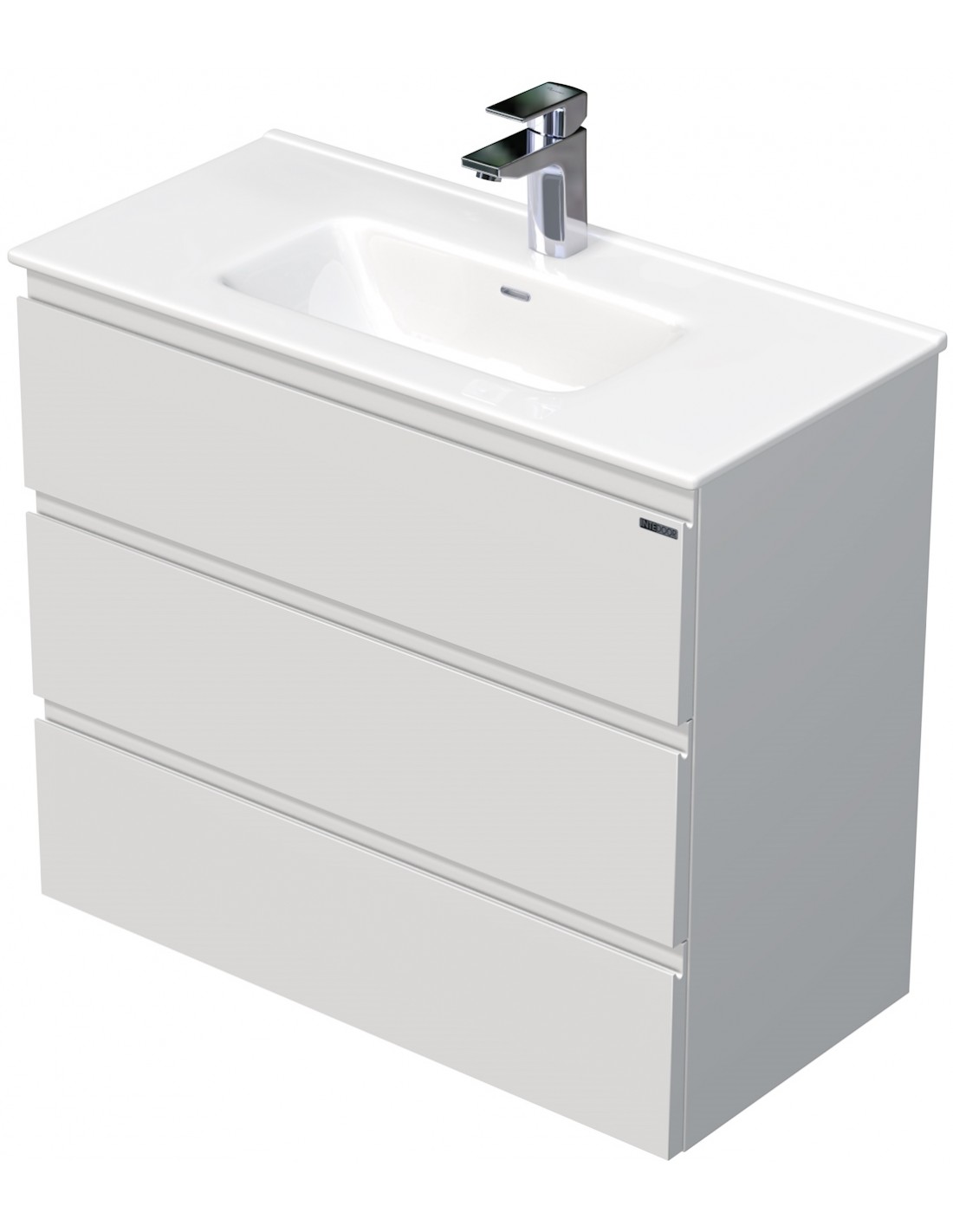 LETTY Mini Komplet badmiljø med håndvask til bordmonteret armatur. Badmiljøet kommer med 3 skuffer med softclose og er fremstillet i MDF. Håndvasken er fremstillet i hvid keramik. Badmiljøet måler 80 / 81 cm i bredden. Det viste armatur medfølger ikke i sættet.