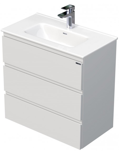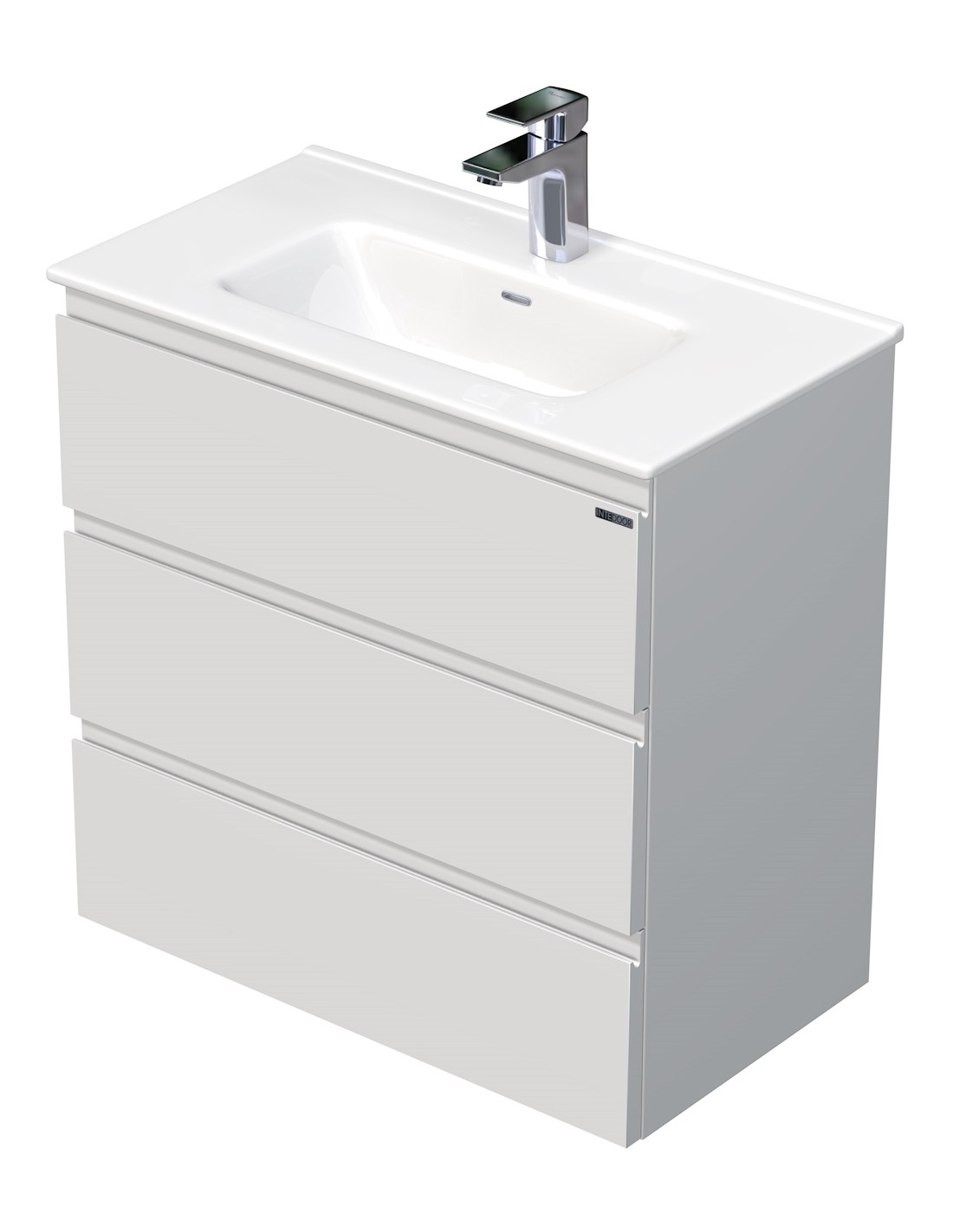 LETTY Mini Komplet badmiljø med håndvask til bordmonteret armatur. Badmiljøet kommer med 3 skuffer med softclose og er fremstillet i MDF. Håndvasken er fremstillet i hvid keramik. Badmiljøet måler 70 / 71 cm i bredden. Det viste armatur medfølger ikke i sættet.