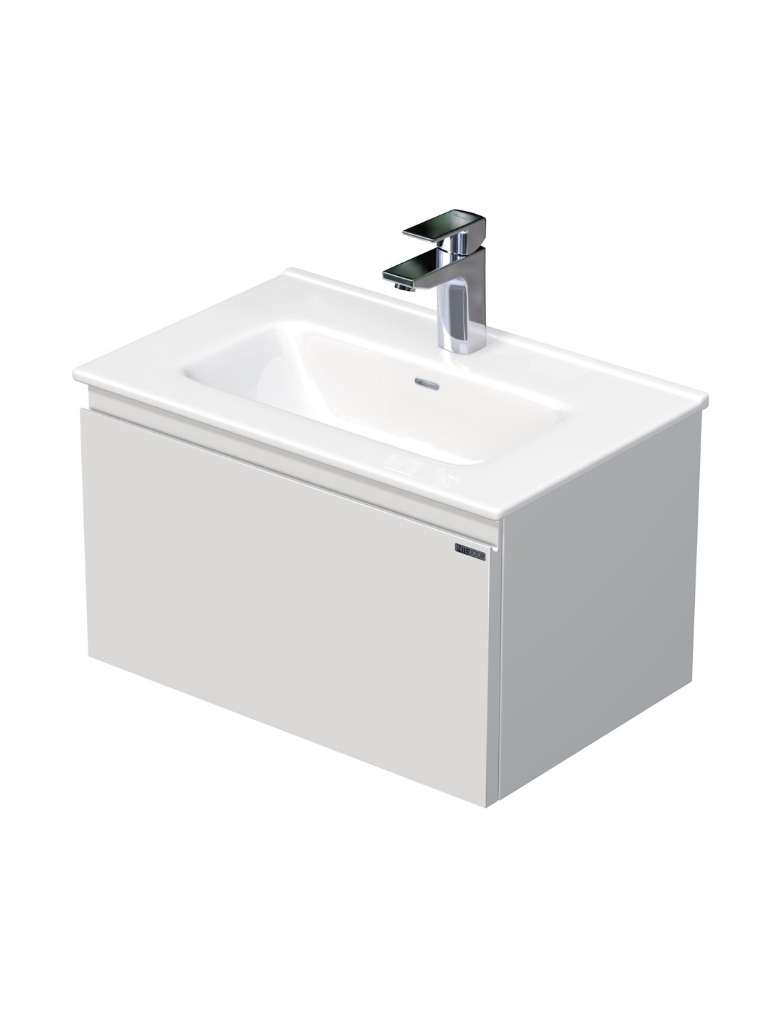 LETTY Mini Komplet badmiljø med håndvask til bordmonteret armatur. Badmiljøet kommer med 1 skuffe med softclose og er fremstillet i MDF. Håndvasken er fremstillet i hvid keramik. Badmiljøet måler 60 / 61 cm i bredden. Det viste armatur medfølger ikke i sættet.