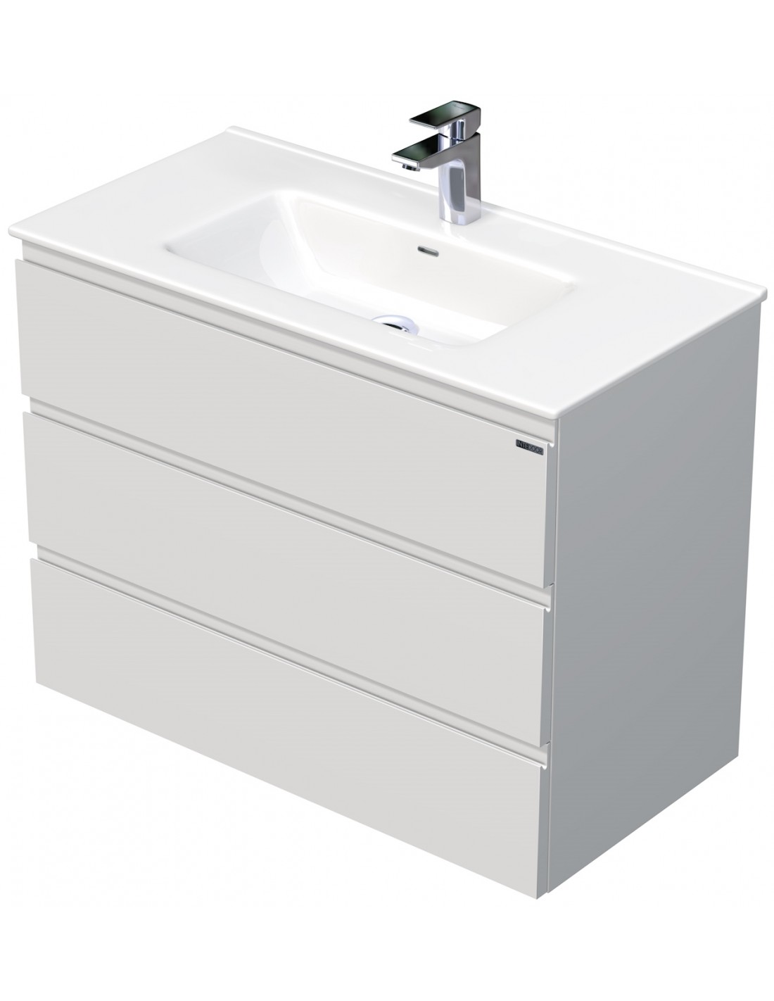 LETTY Komplet badmiljø med håndvask til bordmonteret armatur. Badmiljøet kommer med 3 skuffer med softclose og er fremstillet i MDF. Håndvasken er fremstillet i hvid keramik. Badmiljøet måler 90 / 91 cm i bredden. Det viste armatur medfølger ikke i sættet.