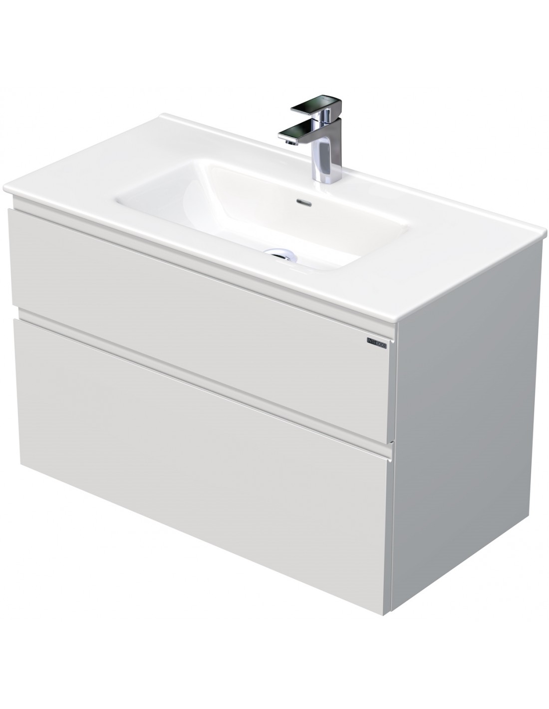 LETTY Komplet badmiljø med håndvask til bordmonteret armatur. Badmiljøet kommer med 2 skuffer med softclose og er fremstillet i MDF. Håndvasken er fremstillet i hvid keramik. Badmiljøet måler 90 / 91 cm i bredden. Det viste armatur medfølger ikke i sættet.