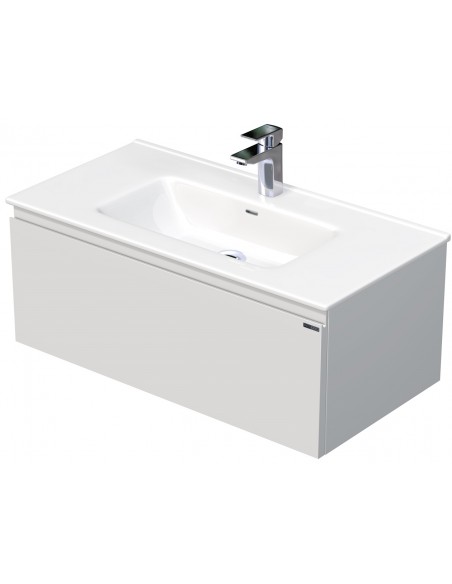 LETTY Komplet badmiljø med håndvask til bordmonteret armatur. Badmiljøet kommer med 1 skuffe med softclose og er fremstillet i MDF. Håndvasken er fremstillet i hvid keramik. Badmiljøet måler 90 / 91 cm i bredden. Det viste armatur medfølger ikke i sættet.