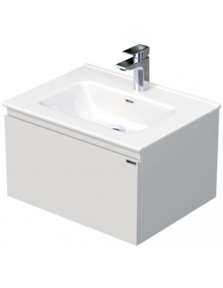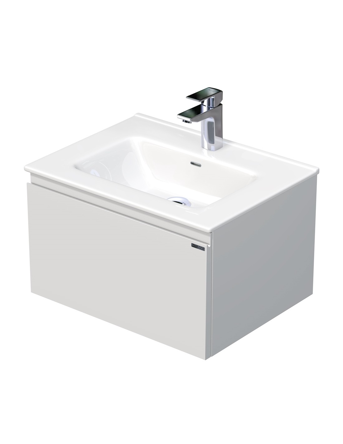 LETTY Komplet badmiljø med håndvask til bordmonteret armatur. Badmiljøet kommer med 1 skuffe med softclose og er fremstillet i MDF. Håndvasken er fremstillet i hvid keramik. Badmiljøet måler 60 / 61 cm i bredden. Det viste armatur medfølger ikke i sættet.