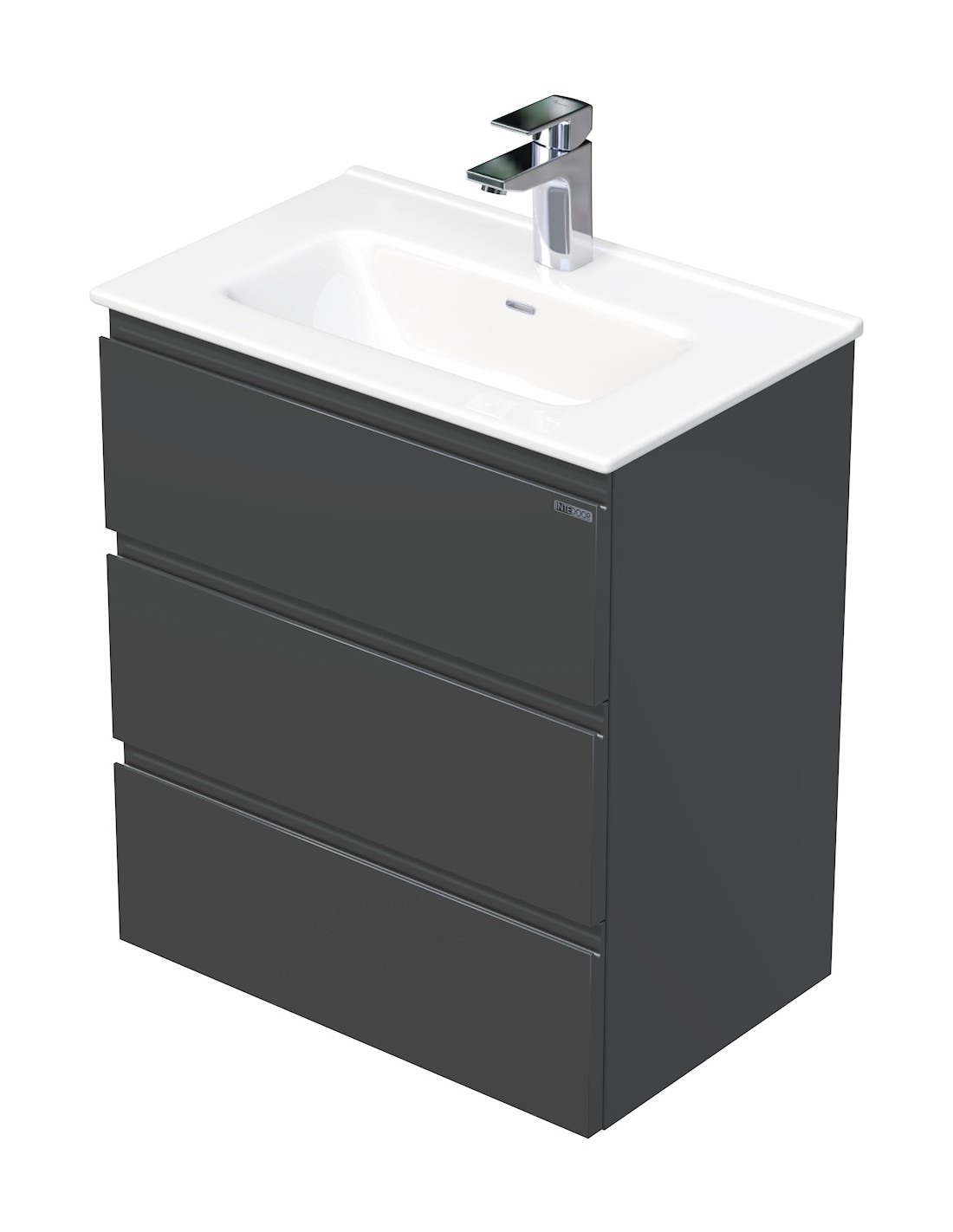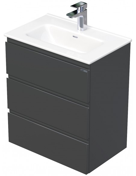 LETTY Mini Komplet badmiljø med håndvask til bordmonteret armatur. Badmiljøet kommer med 3 skuffer med softclose og er fremstillet i MDF. Håndvasken er fremstillet i hvid keramik. Badmiljøet måler 60 / 61 cm i bredden. Det viste armatur medfølger ikke i sættet.