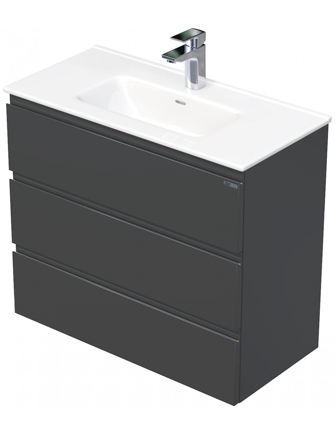 LETTY Mini Komplet badmiljø med håndvask til bordmonteret armatur. Badmiljøet kommer med 3 skuffer med softclose og er fremstillet i MDF. Håndvasken er fremstillet i hvid keramik. Badmiljøet måler 80 / 81 cm i bredden. Det viste armatur medfølger ikke i sættet.
