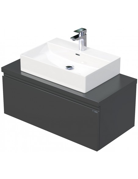 LETTY Komplet badmiljø med håndvask til bordmonteret armatur. Badmiljøet kommer med 1 skuffe med softclose og er fremstillet i MDF. Håndvasken er fremstillet i hvid keramik. Badmiljøet måler 90 cm i bredden. Det viste armatur medfølger ikke i sættet.