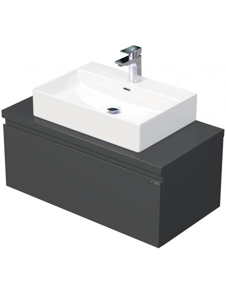 LETTY Komplet badmiljø med håndvask til bordmonteret armatur. Badmiljøet kommer med 1 skuffe med softclose og er fremstillet i MDF. Håndvasken er fremstillet i hvid keramik. Badmiljøet måler 90 cm i bredden. Det viste armatur medfølger ikke i sættet.