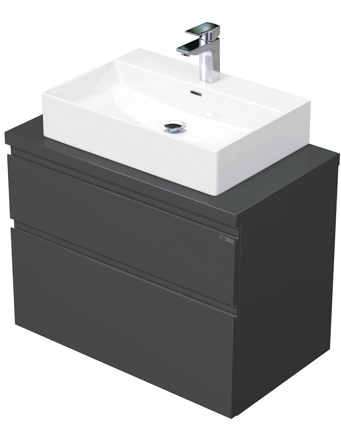 LETTY Komplet badmiljø med håndvask til bordmonteret armatur. Badmiljøet kommer med 2 skuffer med softclose og er fremstillet i MDF. Håndvasken er fremstillet i hvid keramik. Badmiljøet måler 80 cm i bredden. Det viste armatur medfølger ikke i sættet.