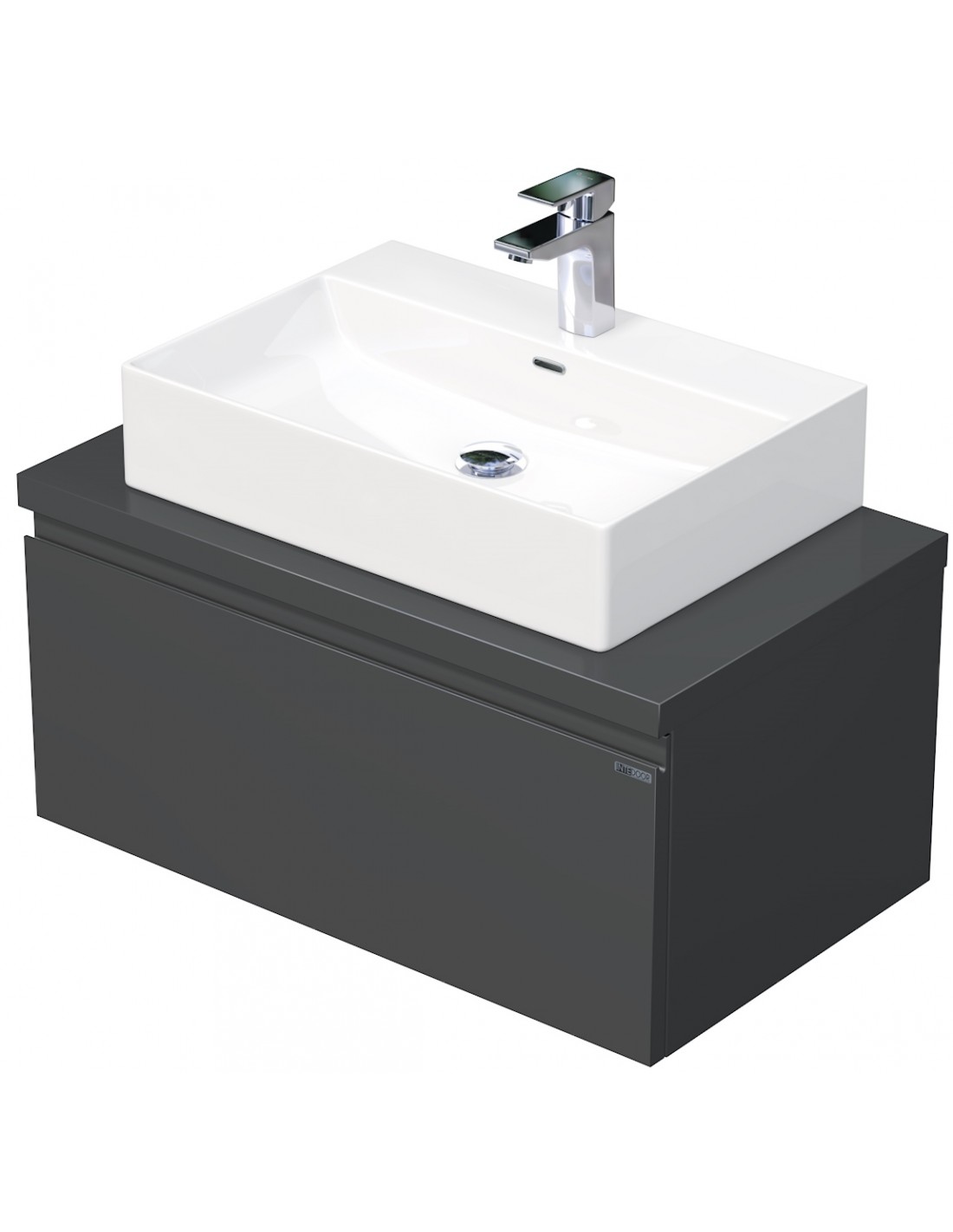 LETTY Komplet badmiljø med håndvask til bordmonteret armatur. Badmiljøet kommer med 1 skuffe med softclose og er fremstillet i MDF. Håndvasken er fremstillet i hvid keramik. Badmiljøet måler 80 cm i bredden. Det viste armatur medfølger ikke i sættet.