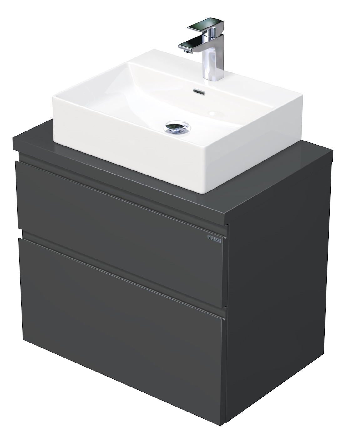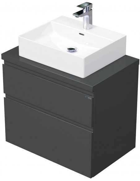LETTY Komplet badmiljø med håndvask til bordmonteret armatur. Badmiljøet kommer med 2 skuffer med softclose og er fremstillet i MDF. Håndvasken er fremstillet i hvid keramik. Badmiljøet måler 70 cm i bredden. Det viste armatur medfølger ikke i sættet.