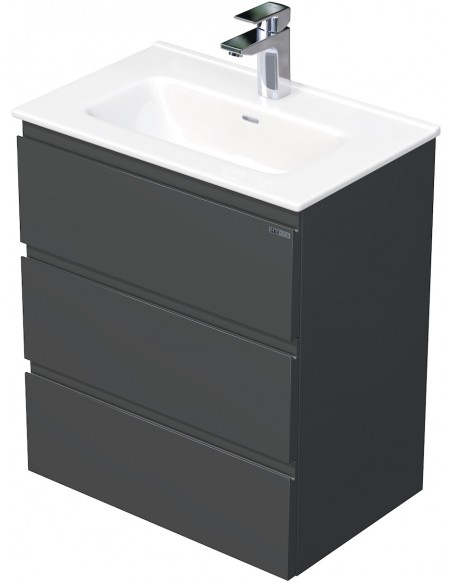 LETTY Mini Komplet badmiljø med håndvask til bordmonteret armatur. Badmiljøet kommer med 3 skuffer med softclose og er fremstillet i MDF. Håndvasken er fremstillet i hvid keramik. Badmiljøet måler 60 / 61 cm i bredden. Det viste armatur medfølger ikke i sættet.