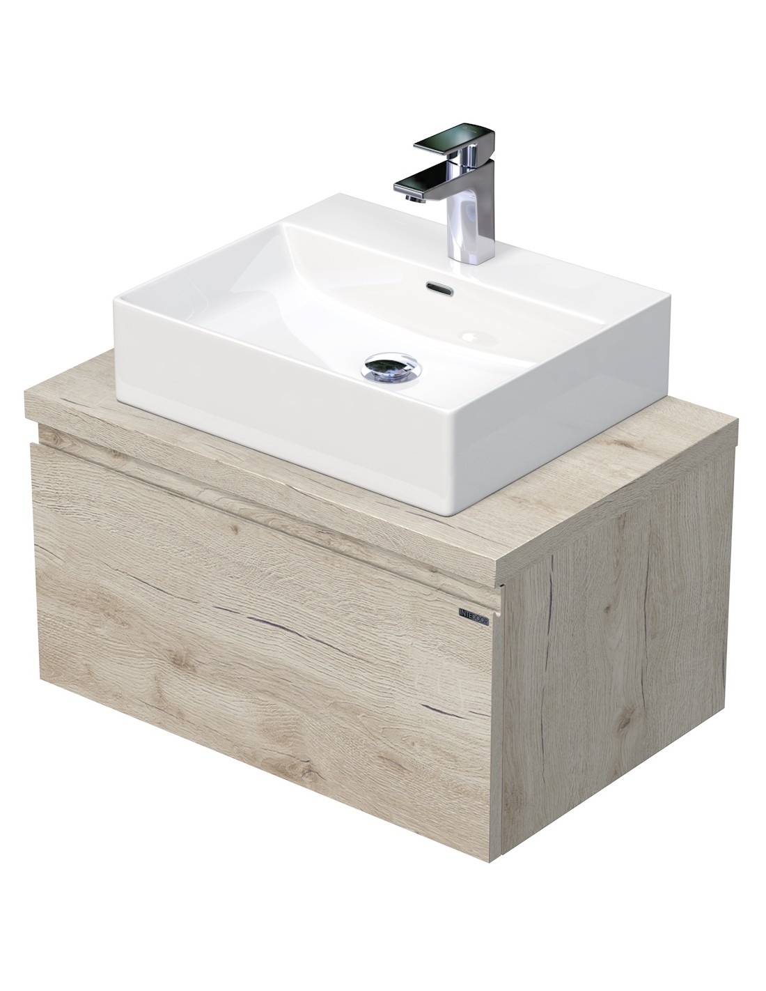 LETTY Komplet badmiljø med håndvask til bordmonteret armatur. Badmiljøet kommer med 1 skuffe med softclose og er fremstillet i MDF. Håndvasken er fremstillet i hvid keramik. Badmiljøet måler 70 cm i bredden. Det viste armatur medfølger ikke i sættet.