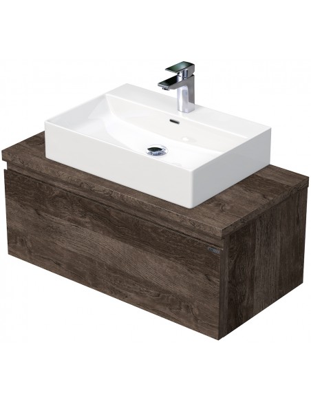LETTY Komplet badmiljø med håndvask til bordmonteret armatur. Badmiljøet kommer med 1 skuffe med softclose og er fremstillet i MDF. Håndvasken er fremstillet i hvid keramik. Badmiljøet måler 90 cm i bredden. Det viste armatur medfølger ikke i sættet.