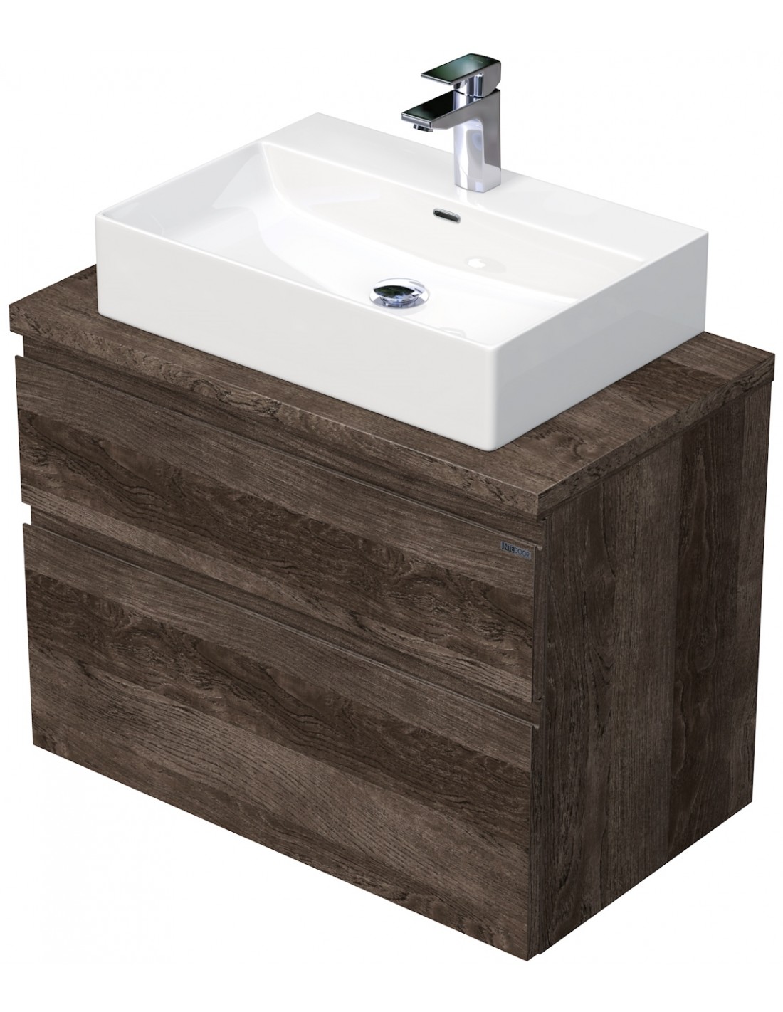 LETTY Komplet badmiljø med håndvask til bordmonteret armatur. Badmiljøet kommer med 2 skuffer med softclose og er fremstillet i MDF. Håndvasken er fremstillet i hvid keramik. Badmiljøet måler 80 cm i bredden. Det viste armatur medfølger ikke i sættet.