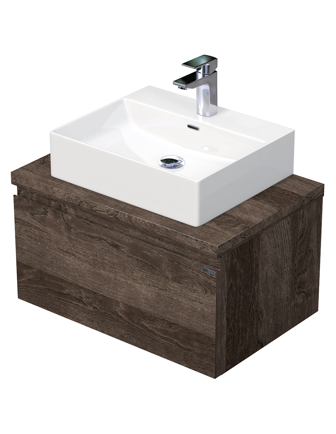 LETTY Komplet badmiljø med håndvask til bordmonteret armatur. Badmiljøet kommer med 1 skuffe med softclose og er fremstillet i MDF. Håndvasken er fremstillet i hvid keramik. Badmiljøet måler 70 cm i bredden. Det viste armatur medfølger ikke i sættet.