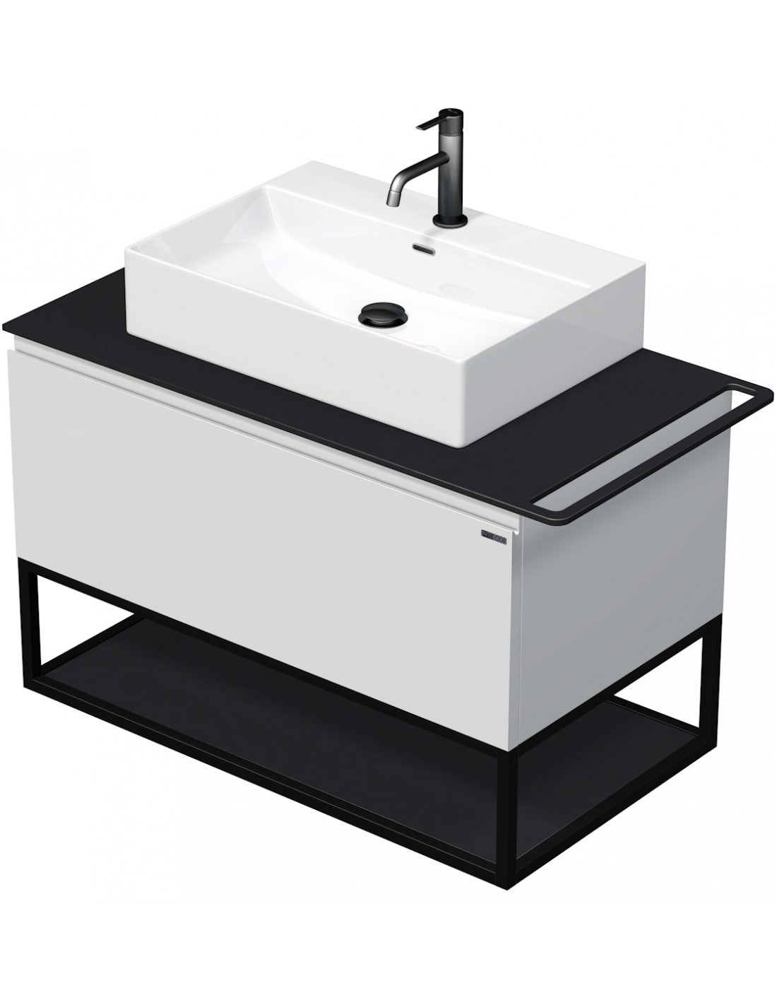 TARA Komplet badmiljø med 1 håndvask til bordmonteret armatur. Badmiljøet kommer med 1 skuffe med softclose og er fremstillet i HPL og MDF. Hertil opbevaringshylde i aluminium, til ekstra opbevaring. Håndvasken er fremstillet i keramik. Badmiljøet måler 98 cm i bredden. Det viste armatur og bundventil medfølger ikke i sættet.