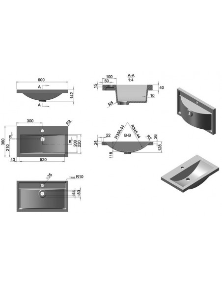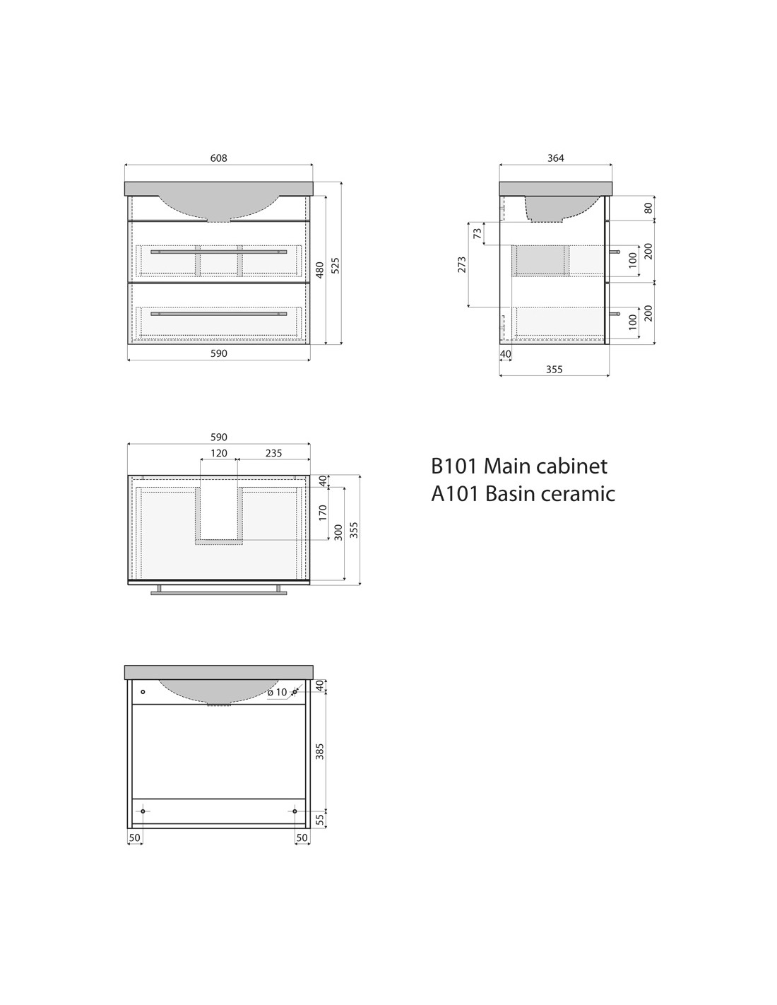 Komplet badmiljø med vask, udført i et design af mdf og keramik. Badmiljøet måler 52,5 cm i højden og 60,8 x 36,4 cm i bredde og dybde.