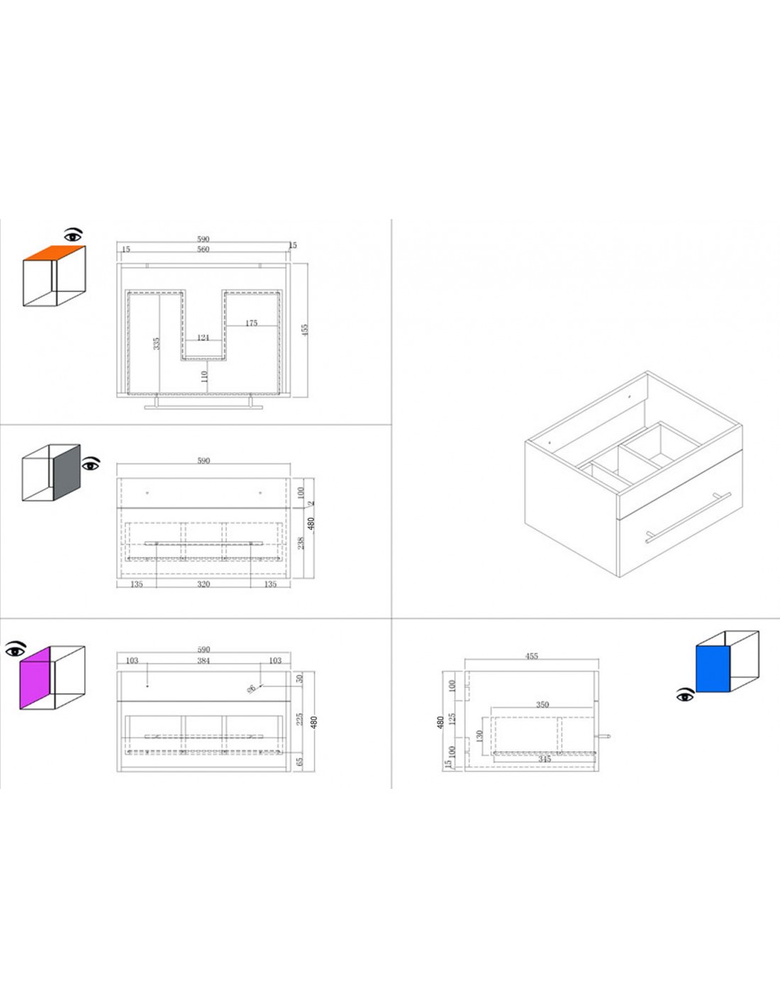 Komplet badmiljø med vask, udført i et design af mdf og mineralsten. Badmiljøet måler 49,7 cm i højden og 61,5 x 46,5 cm i bredde og dybde.