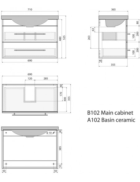 Komplet badmiljø med vask, udført i et design af mdf og keramik. Badmiljøet måler 52,5 cm i højden og 71 x 36,5 cm i bredde og dybde.