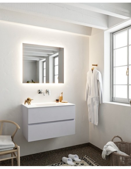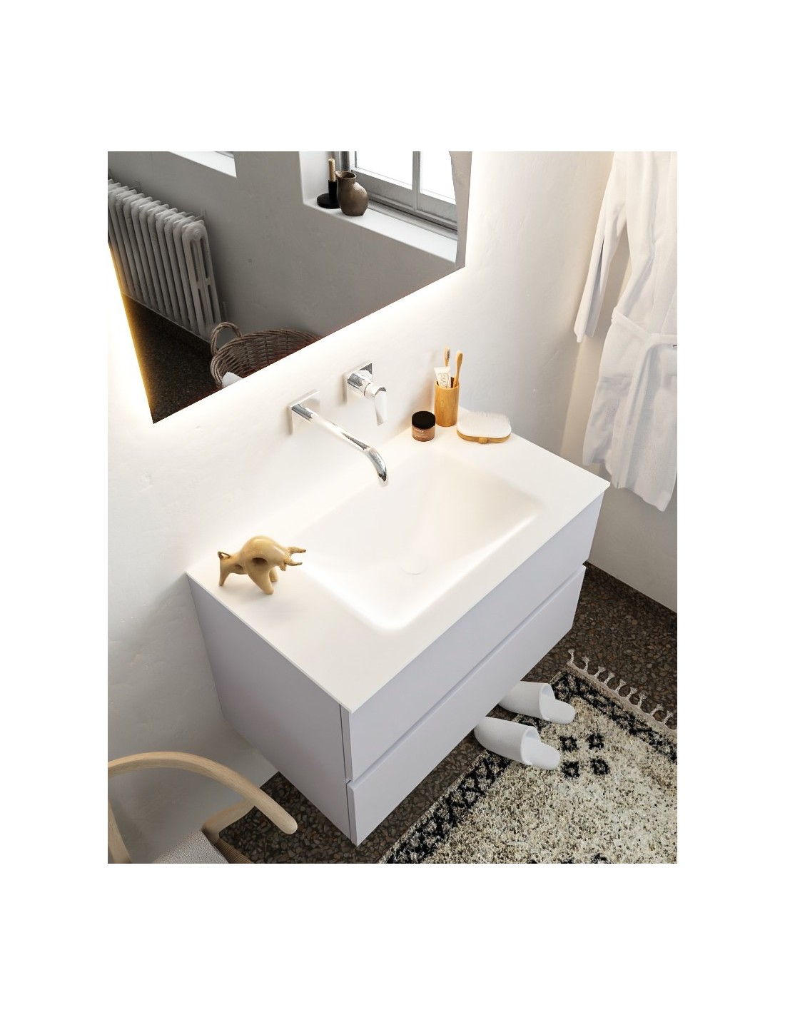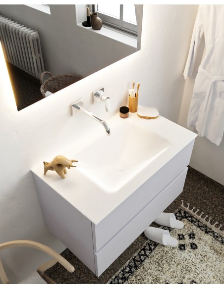 VICA Komplet badmiljø med midt centreret håndvask til vægmonteret armatur. Badmiljøet kommer med 2 skuffer med fuldt udtræk, og er fremstillet i MDF. Håndvasken er fremstillet i talkum farvet (mat hvid) solid surface. Badmiljøet måler 80 cm i bredden. Det viste armatur medfølger ikke i sættet.