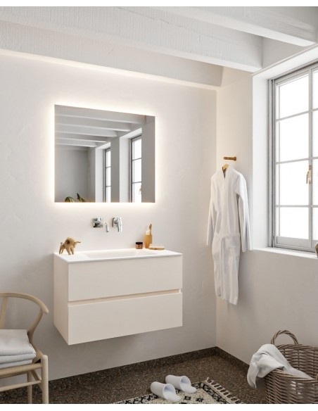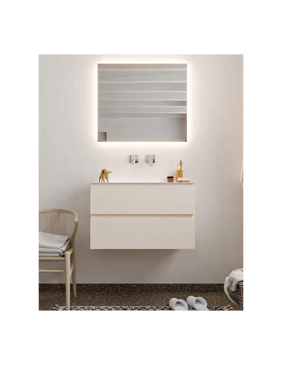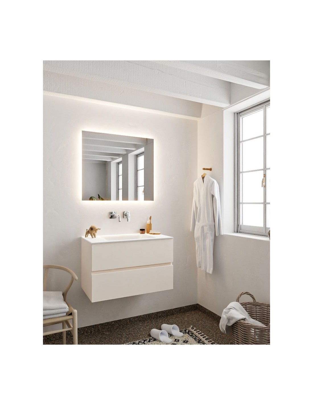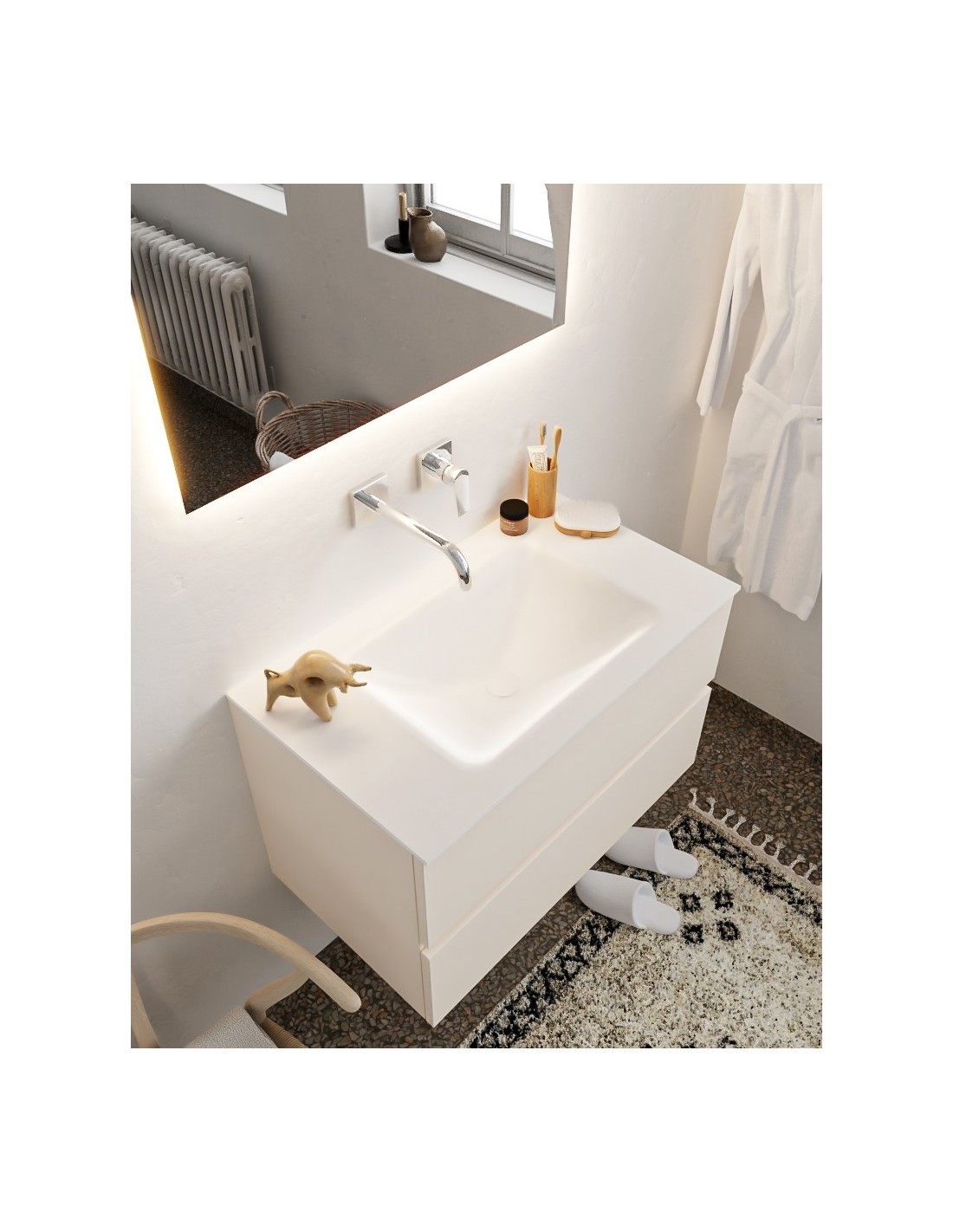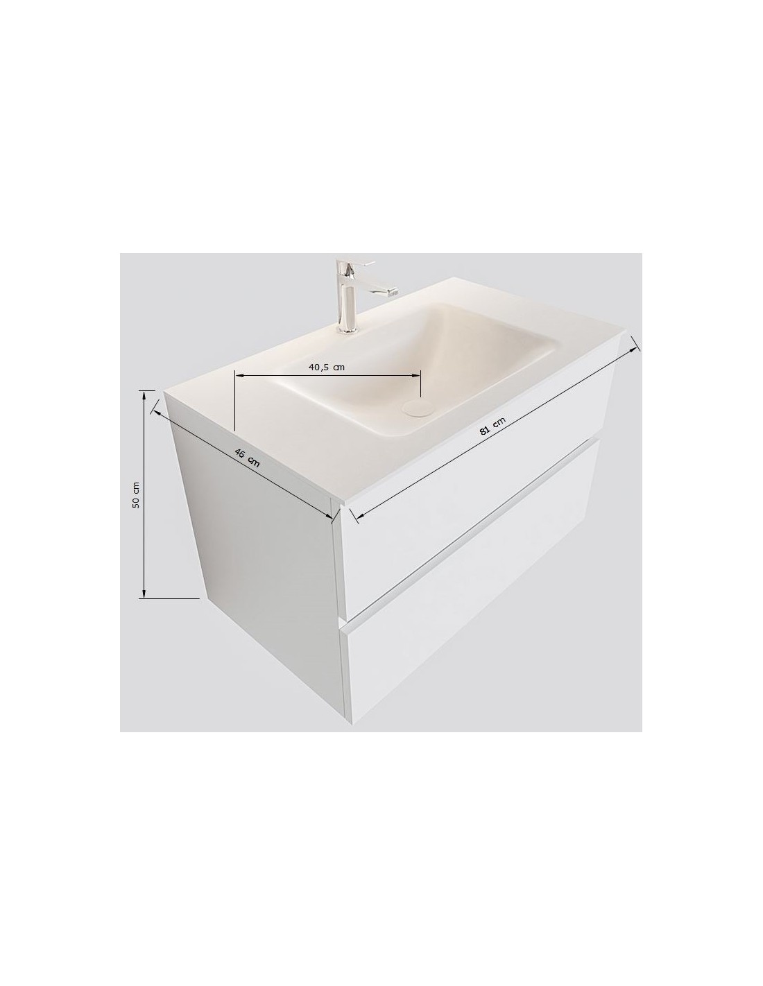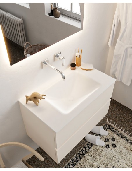 VICA Komplet badmiljø med midt centreret håndvask til vægmonteret armatur. Badmiljøet kommer med 2 skuffer med fuldt udtræk, og er fremstillet i MDF. Håndvasken er fremstillet i talkum farvet (mat hvid) solid surface. Badmiljøet måler 80 cm i bredden. Det viste armatur medfølger ikke i sættet.