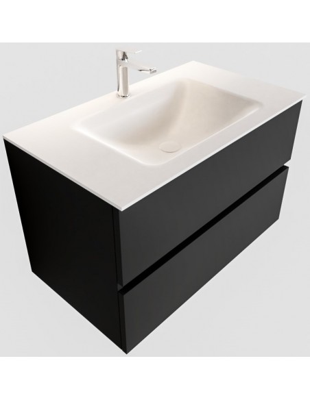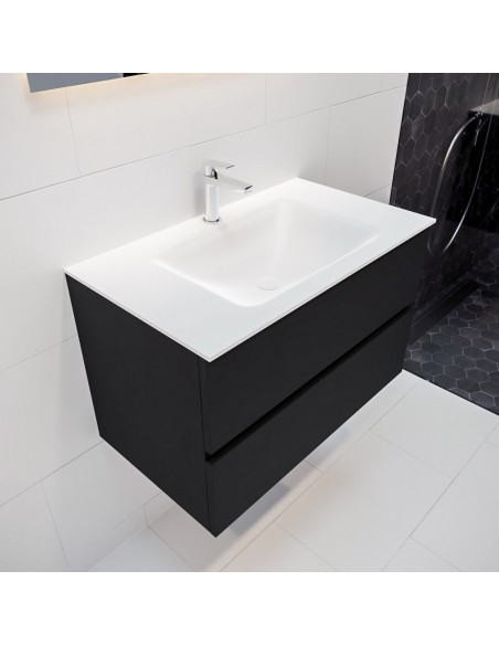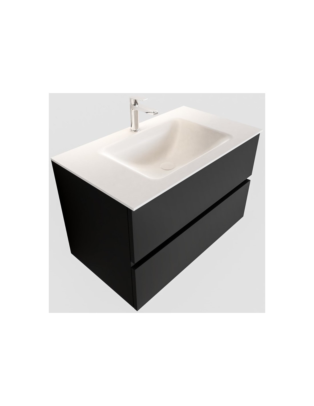 VICA Komplet badmiljø med midt centreret håndvask til bordmonteret armatur. Badmiljøet kommer med 2 skuffer med fuldt udtræk, og er fremstillet i MDF. Håndvasken er fremstillet i talkum farvet (mat hvid) solid surface. Badmiljøet måler 80 cm i bredden. Det viste armatur medfølger ikke i sættet.