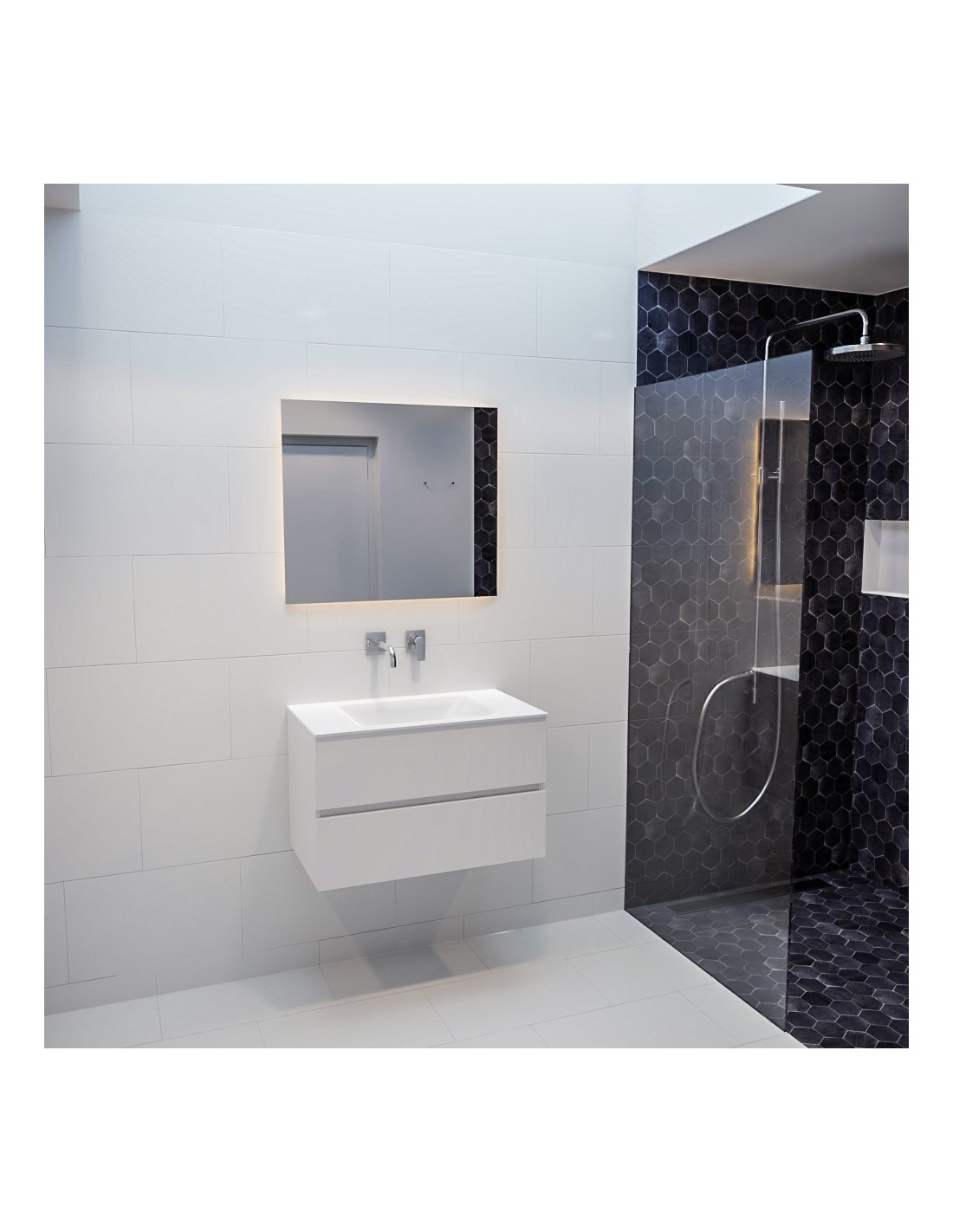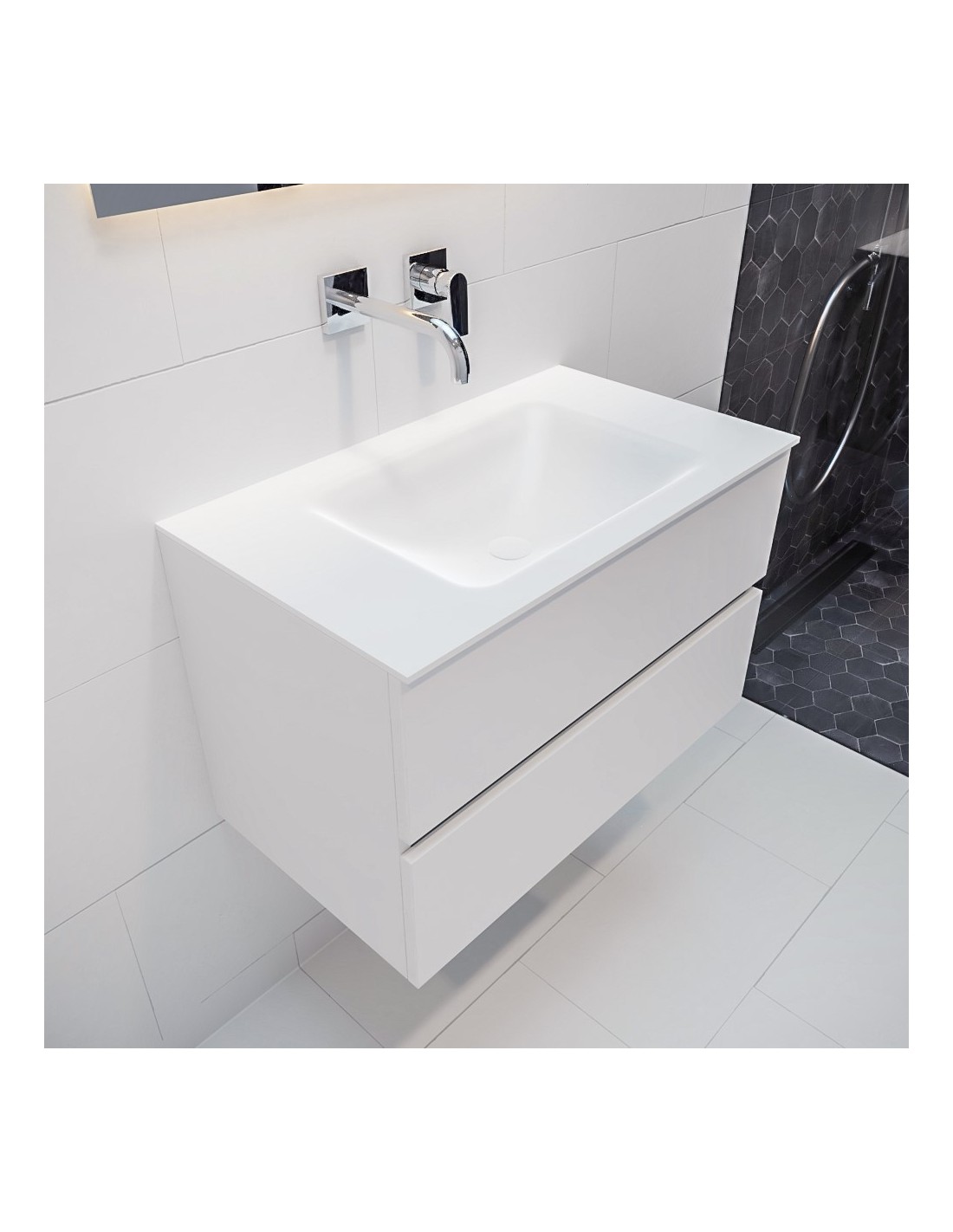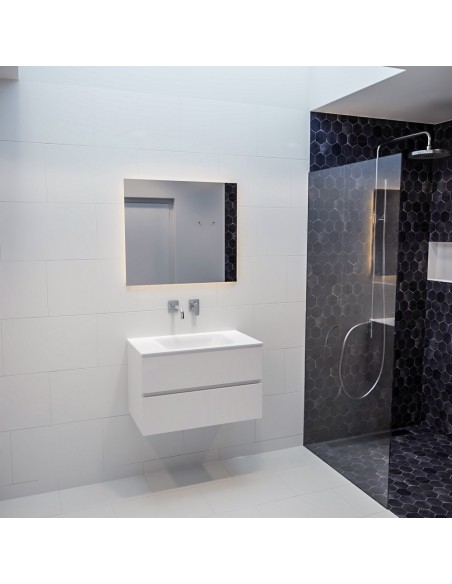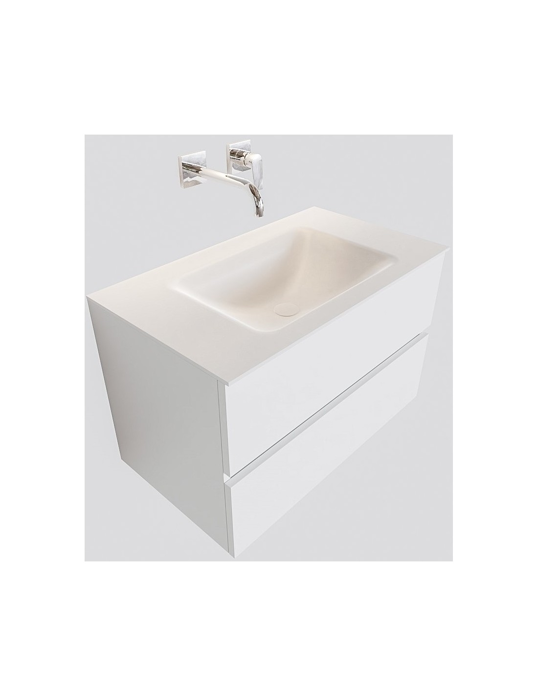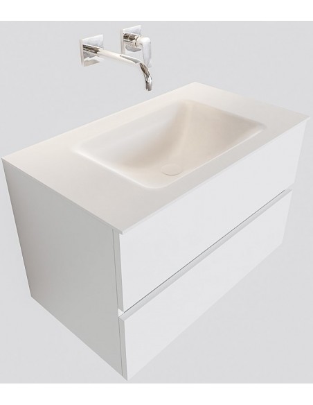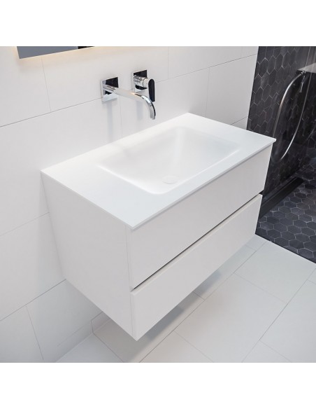 VICA Komplet badmiljø med midt centreret håndvask til vægmonteret armatur. Badmiljøet kommer med 2 skuffer med fuldt udtræk, og er fremstillet i MDF. Håndvasken er fremstillet i talkum farvet (mat hvid) solid surface. Badmiljøet måler 80 cm i bredden. Det viste armatur medfølger ikke i sættet.