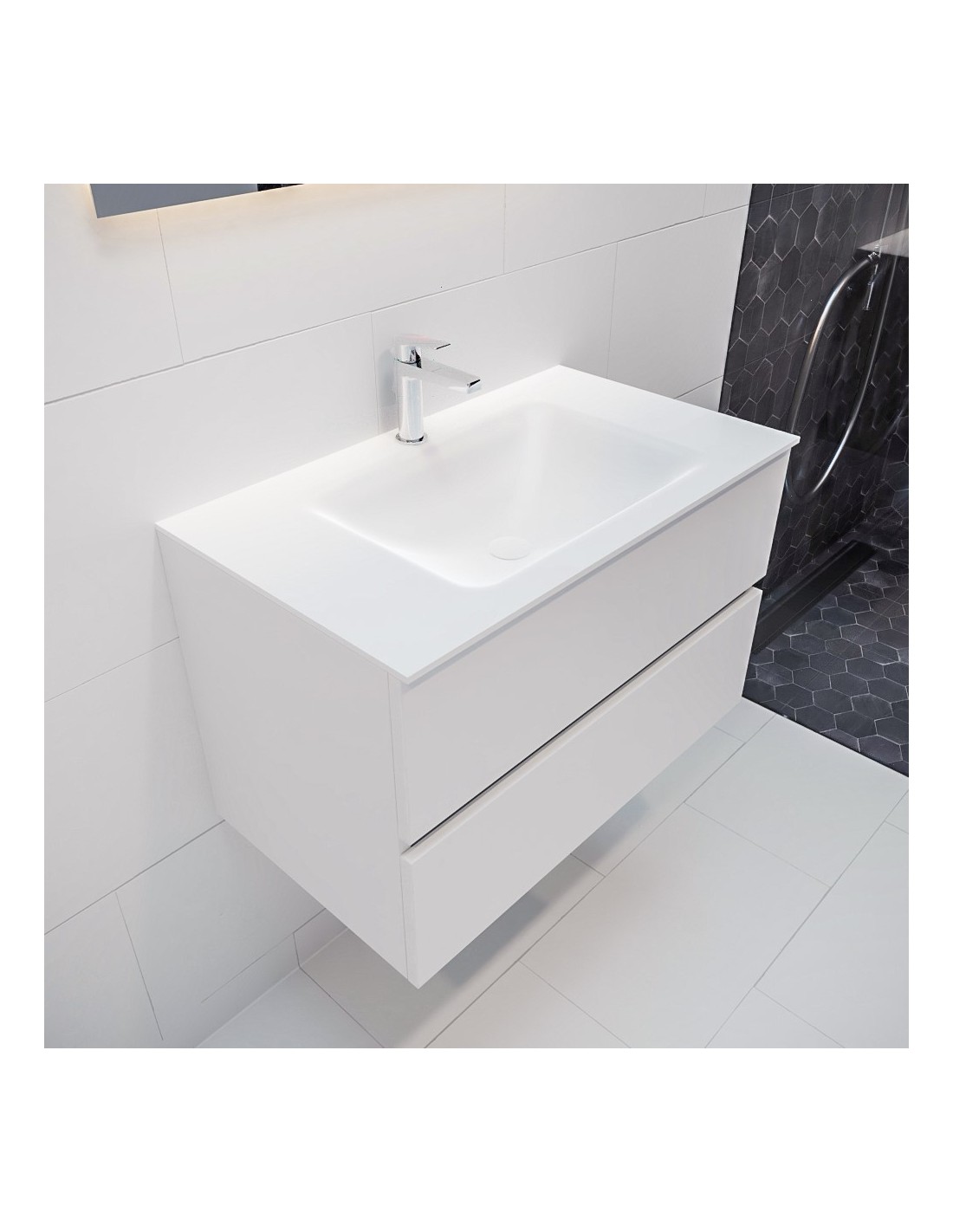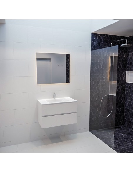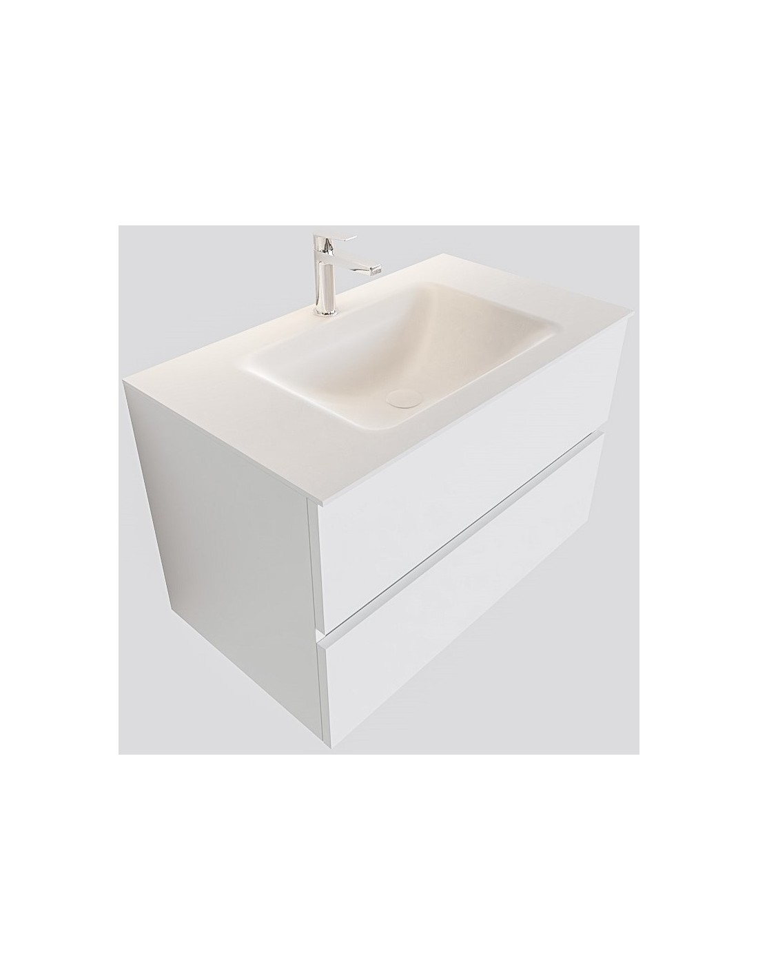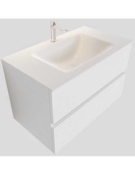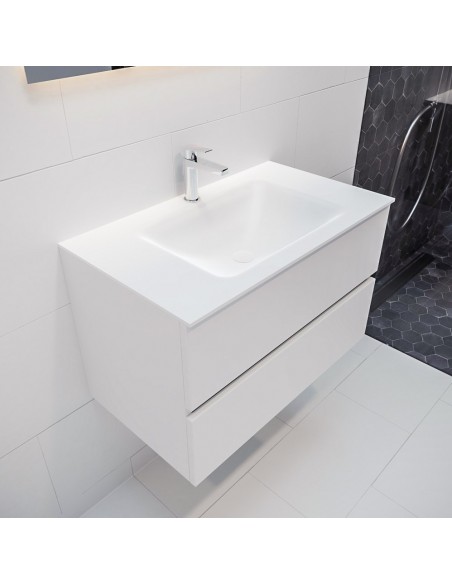 VICA Komplet badmiljø med midt centreret håndvask til bordmonteret armatur. Badmiljøet kommer med 2 skuffer med fuldt udtræk, og er fremstillet i MDF. Håndvasken er fremstillet i talkum farvet (mat hvid) solid surface. Badmiljøet måler 80 cm i bredden. Det viste armatur medfølger ikke i sættet.