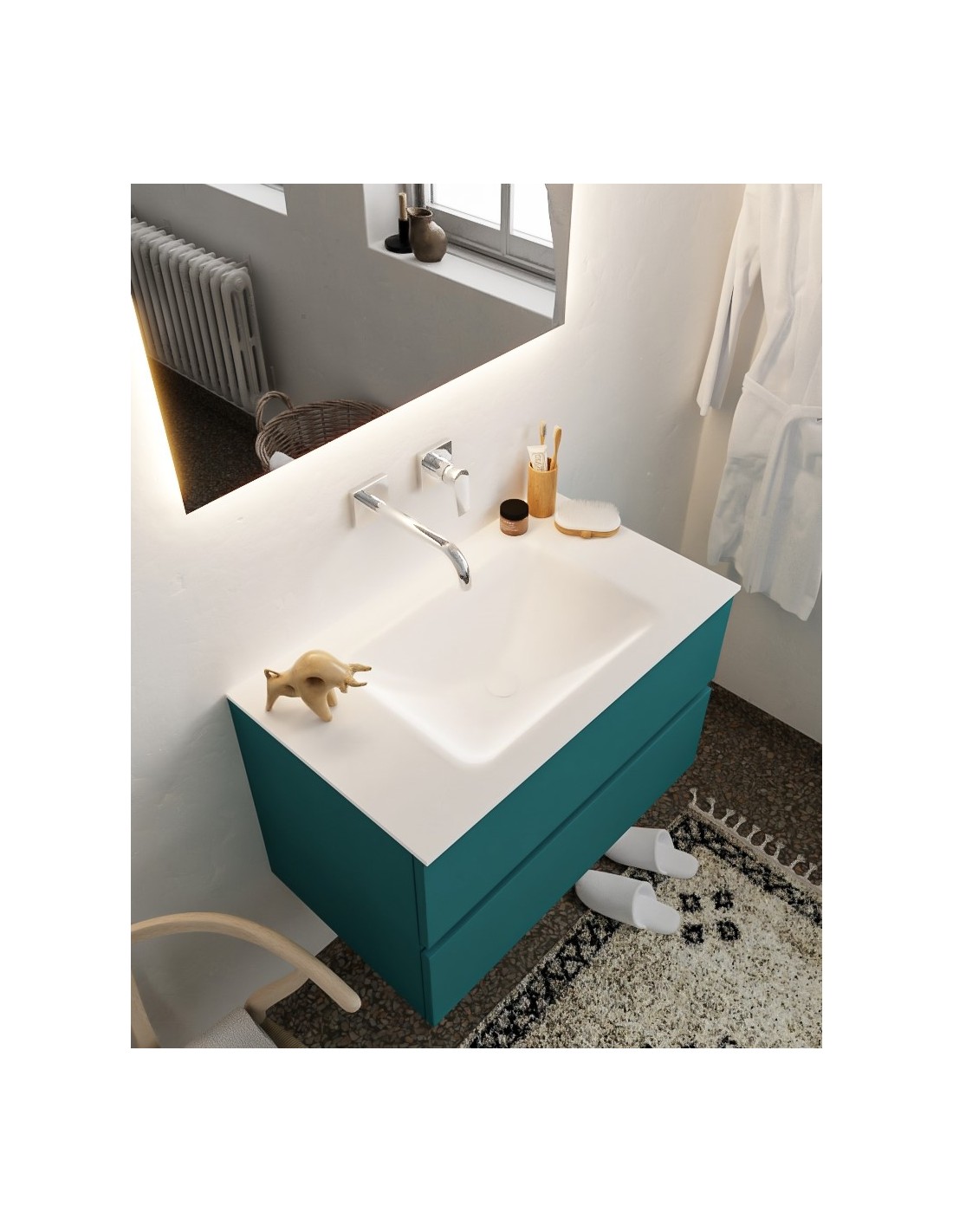 VICA Komplet badmiljø med midt centreret håndvask til vægmonteret armatur. Badmiljøet kommer med 2 skuffer med fuldt udtræk, og er fremstillet i MDF. Håndvasken er fremstillet i talkum farvet (mat hvid) solid surface. Badmiljøet måler 80 cm i bredden. Det viste armatur medfølger ikke i sættet.