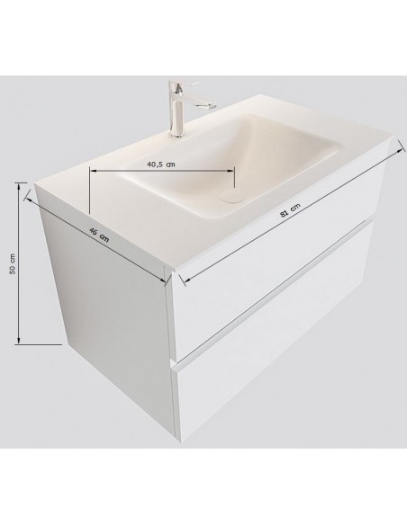 VICA Komplet badmiljø med midt centreret håndvask til vægmonteret armatur. Badmiljøet kommer med 2 skuffer med fuldt udtræk, og er fremstillet i MDF. Håndvasken er fremstillet i talkum farvet (mat hvid) solid surface. Badmiljøet måler 80 cm i bredden. Det viste armatur medfølger ikke i sættet.