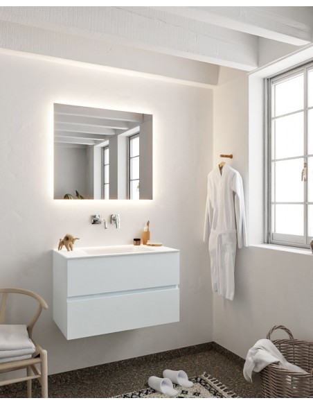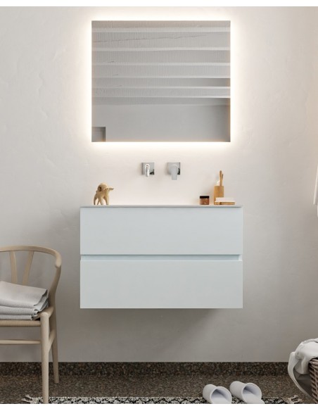 VICA Komplet badmiljø med midt centreret håndvask til vægmonteret armatur. Badmiljøet kommer med 2 skuffer med fuldt udtræk, og er fremstillet i MDF. Håndvasken er fremstillet i talkum farvet (mat hvid) solid surface. Badmiljøet måler 80 cm i bredden. Det viste armatur medfølger ikke i sættet.