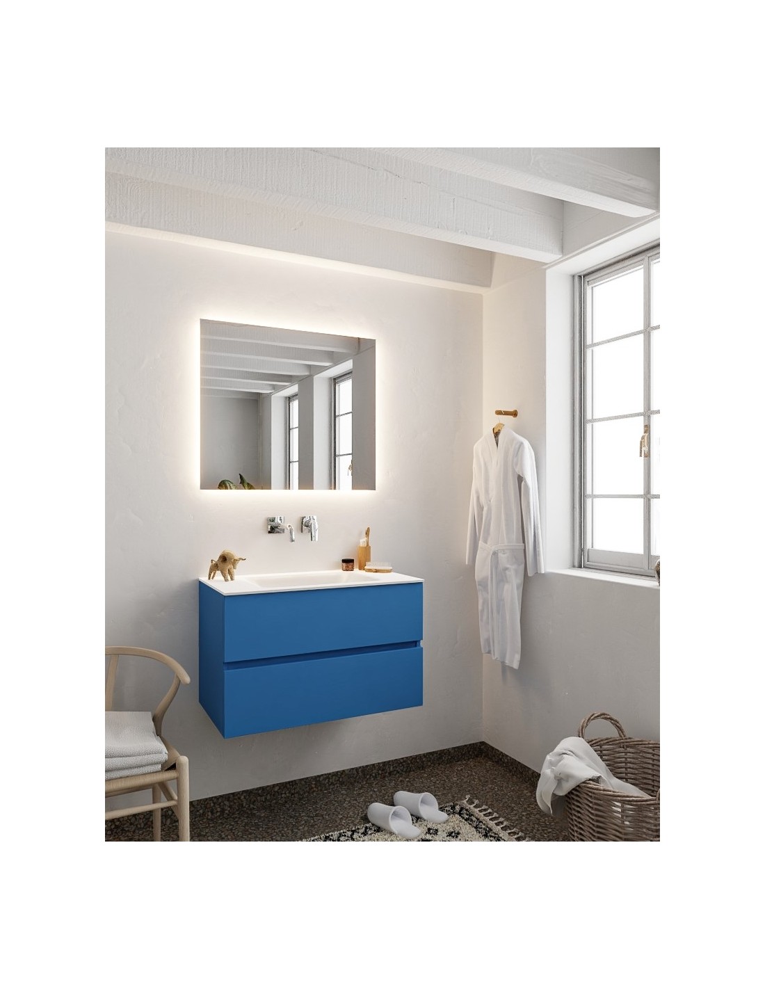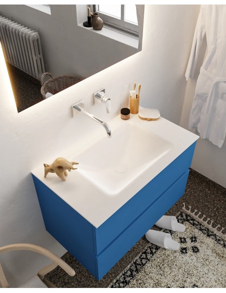 VICA Komplet badmiljø med midt centreret håndvask til vægmonteret armatur. Badmiljøet kommer med 2 skuffer med fuldt udtræk, og er fremstillet i MDF. Håndvasken er fremstillet i talkum farvet (mat hvid) solid surface. Badmiljøet måler 80 cm i bredden. Det viste armatur medfølger ikke i sættet.