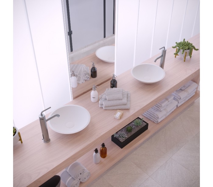 Håndvask i et design fra Hollandske Ideavit. Håndvasken er fremstillet i materialet "Solid Surface", der ikke alene giver badeværelset et stilrent design, men samtidig er lækkert at røre ved. Håndvasken måler 35 cm i diameter og 9 cm i højden (ydermål). Leveres uden pop-up bundventil med cover (eventuelt reference 281149).