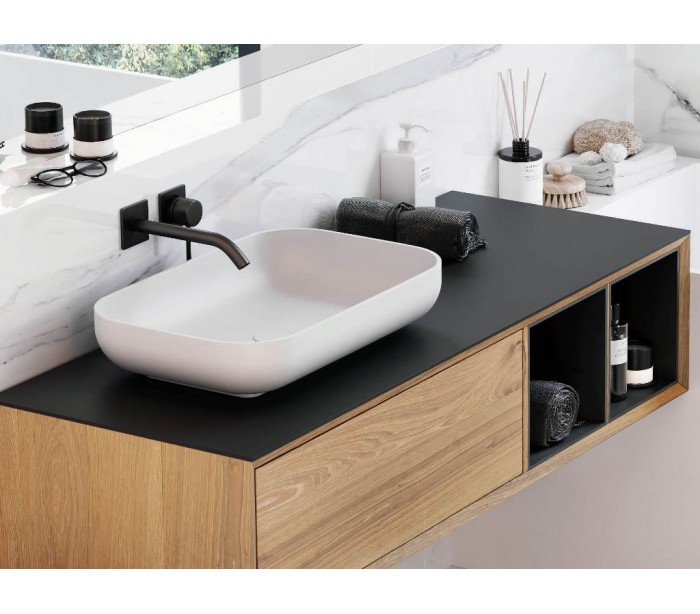 Senstone®-materialet er et mineralsk materiale med et mathvidt look. Det imponerer med sin sømløse behandling, som altid garanterer det højeste niveau af hygiejne i badeværelset.