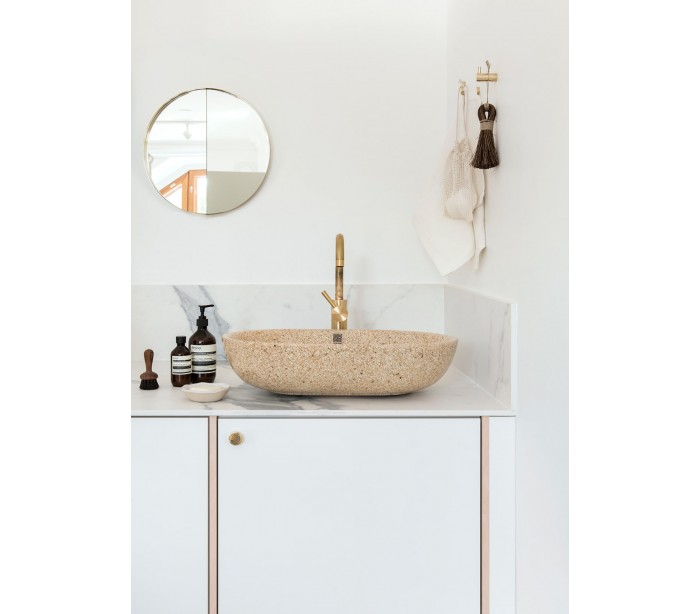Woodio Soft60 håndvask fremstillet i bæredygtige materialer fra de Finske skove (80% ren træ/20% resin) og udført i en blød form, der gør håndvasken meget behageligt at røre ved. Cover til bundventilen medfølger for et komplet udtryk.