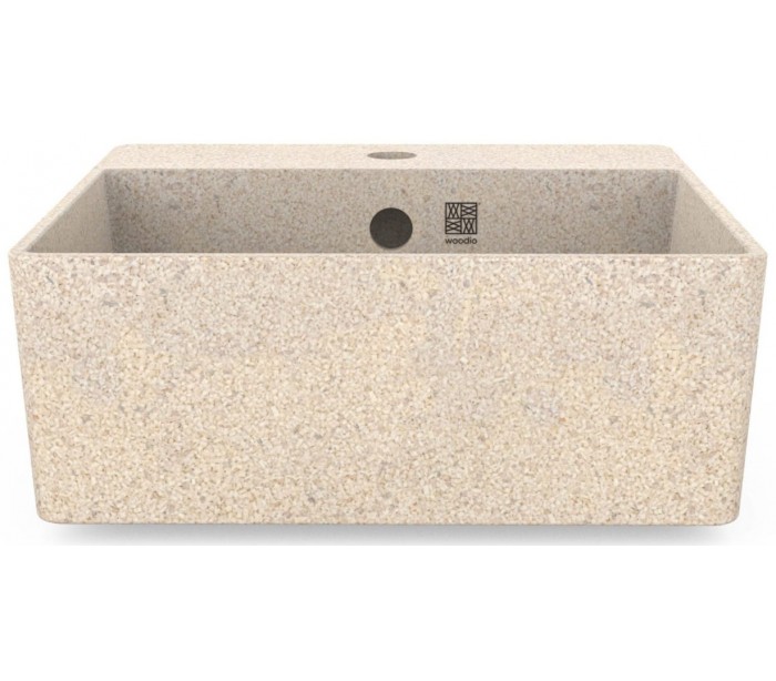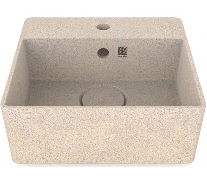 Woodio Cube40 håndvask fremstillet i bæredygtige materialer fra de Finske skove (80% ren træ/20% resin) og udført i en blød form, der gør håndvasken meget behageligt at røre ved. Cover til bundventilen medfølger for et komplet udtryk. Der er hanehul i vasken, samt overløb.