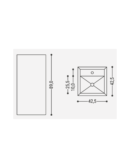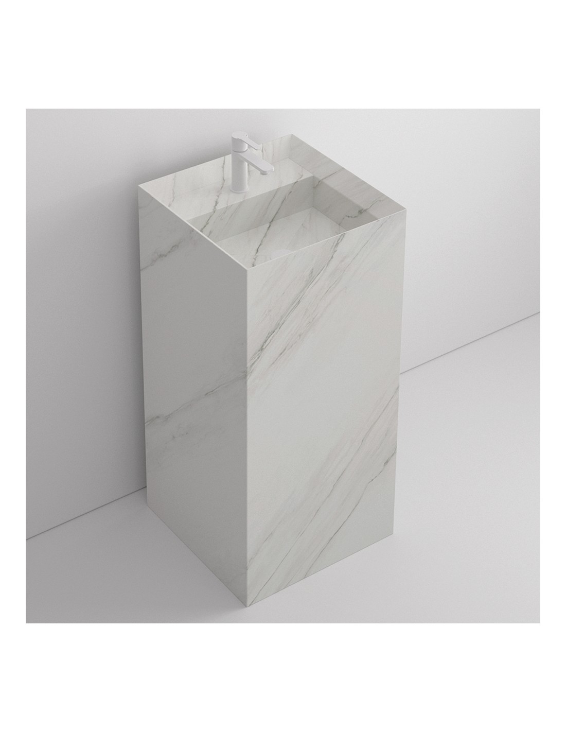 Fritstående gulvmonteret håndvask, udført i et moderne design i hvid marmoriseret porcelæn. Håndvasken måler 89 cm i højden og 42,5 cm i bredde og dybde (ydermål). Rørudførelse på bagsiden. Leveres uden pop-up bundventil. Denne model er med forboret hanehul/armaturhul.