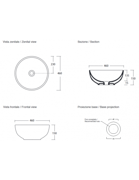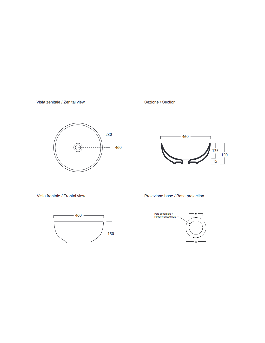 DIMP håndvask udført i et moderne design i keramik. Håndvasken måler 15 cm i højden og 46 cm i diameter (ydermål) og leveres med pop-up bundventil.