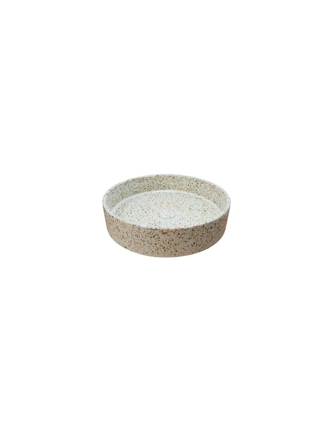 Håndvask fra Hollandske Ideavit, fremstillet i et design af lys terrazzofarvet beton. Håndvasken måler 42,5 cm i diameter og 10 cm i højden (ydermål). Leveres med pop-up bundventil med cover i beton (samme farve som håndvasken). Håndvasken har nano-cover for ekstra beskyttelse.