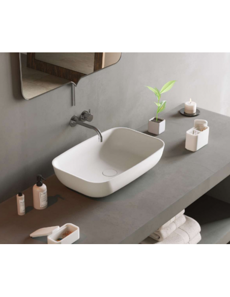 Håndvask i et design fra Hollandske Ideavit. Håndvasken er fremstillet i materialet "Solid Surface", der ikke alene giver badeværelset et stilrent design, men samtidig er lækkert at røre ved. Håndvasken måler 55 x 35 cm i diameter og 13 cm i højden (ydermål). Leveres uden pop-up bundventil med cover (reference 281149).